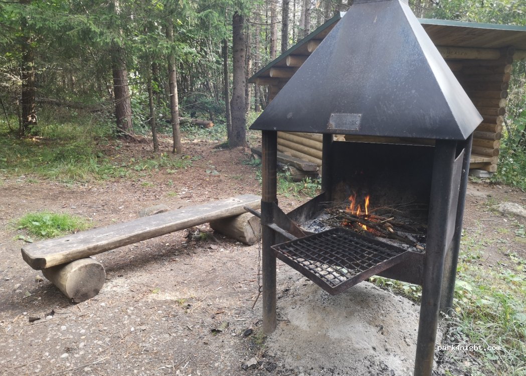 Aire de pique-nique officielle de la RMK avec foyer, table et bancs couverts, toilettes sèches, bois de chauffage, abri pour dormir et poubelle.
