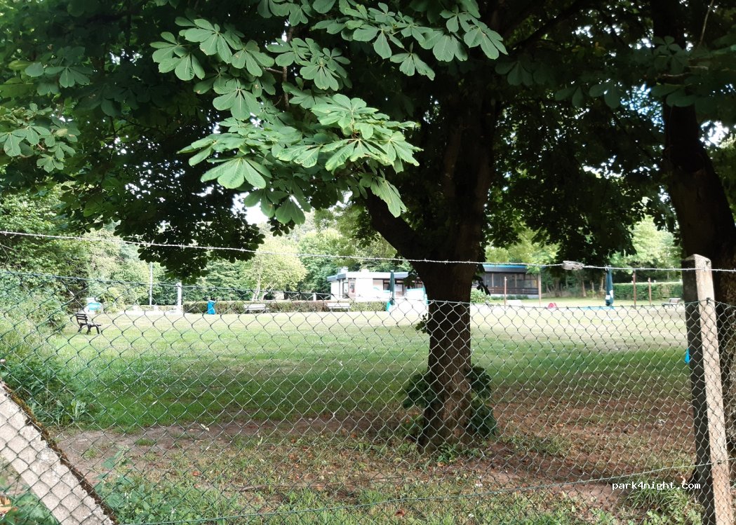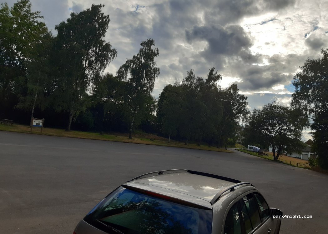 Hiking car park at the forest swimming pool. Very large, flat, tarred, quiet, partly shaded.