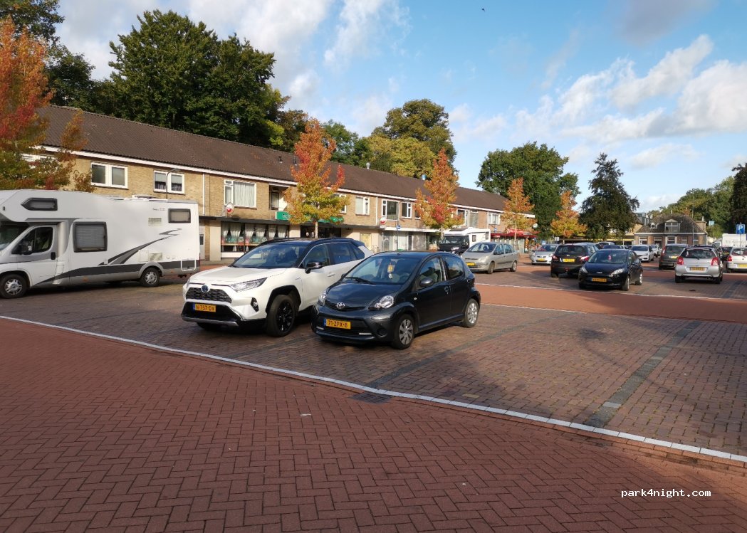 Parkeerplaats in centrum van dorp op ruim parjeerterrein met supermarkten en diverse winkels en eetgelegenheden er naast.