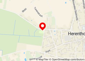 Een grote, met gras begroeide parkeerplaats die toegankelijk is voor alle voertuigen vlakbij de weg.