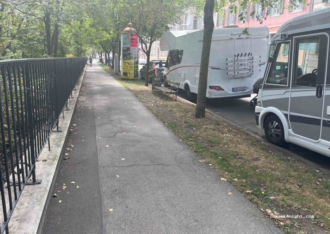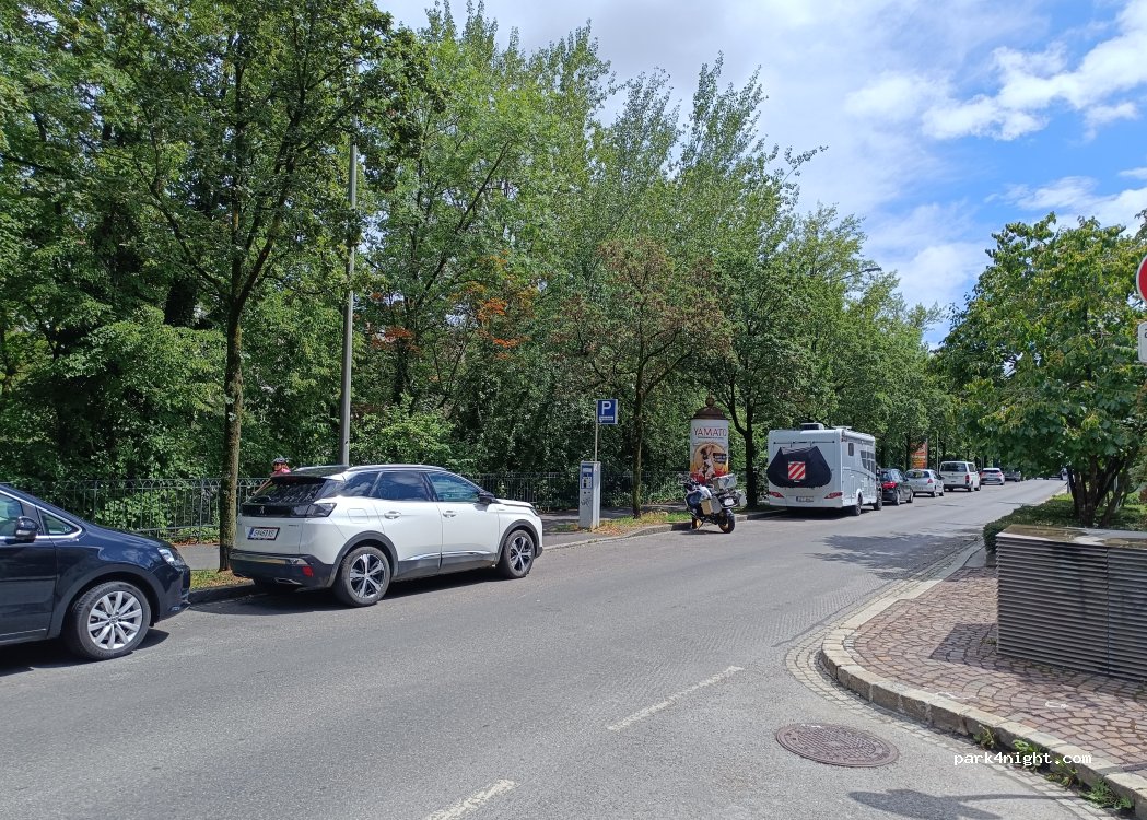 Lunga fila di posti a pagamento ma gratis sabato e domenica e nei festivi. larghi abbastanza per camper ma accostandosi bene al marciapiede. a circa 15 minuti a piedi dal centro. Diverse linee di tram gratuiti tutti i giorni!