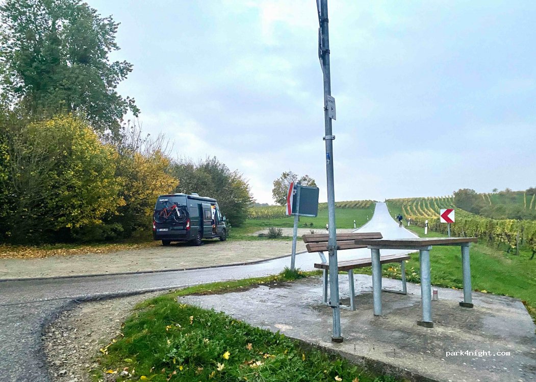 Parkplatz La Chapelle oberhalb von Nittel. Herrlicher Blick auf die Weinberge und das Moseltal. Picknicktisch. Ein paar vorbeifahrende Autos. Platz für 3 Transporter. Abfahrt von Spaziergängen. Konservieren!