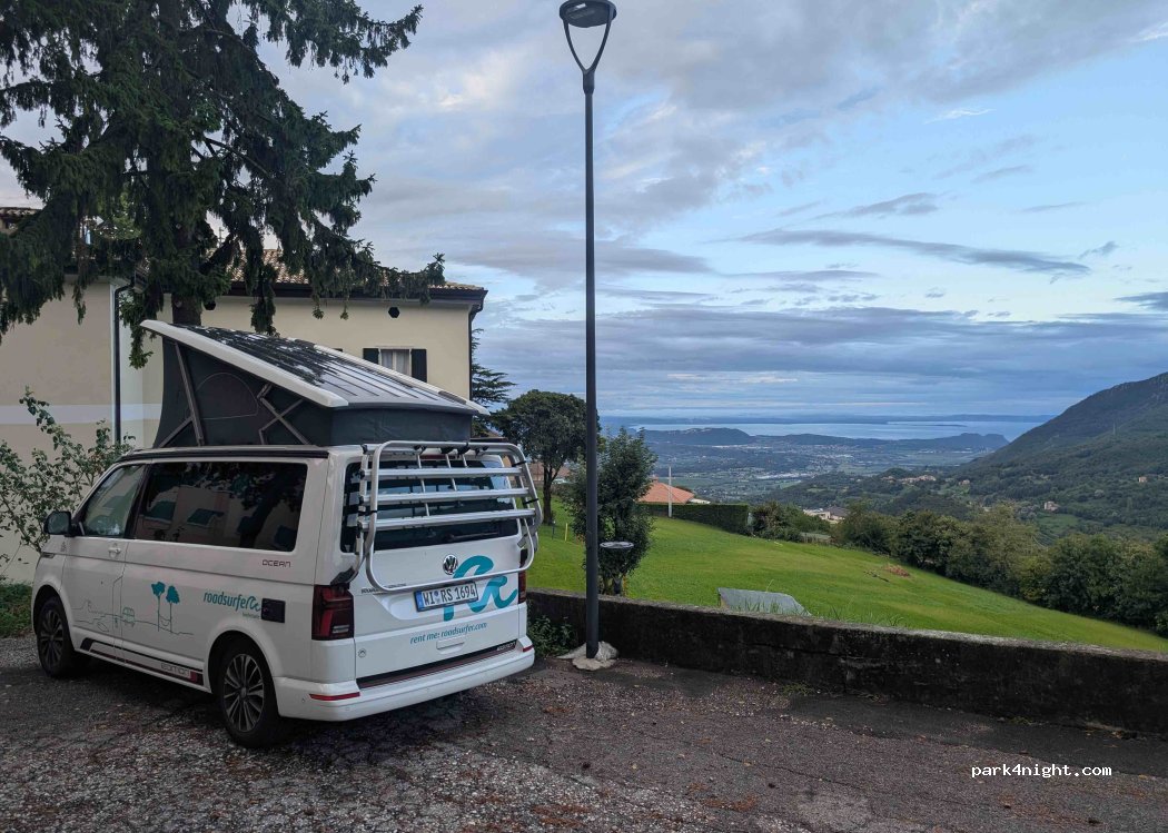 Wir hatten hier eine ruhige Übernachtung, leicht schräger Untergrund, dafür Megaaussicht für lau! Es waren 2 Kastenwagen über Nacht hier und 2 geparkte PKW's. Der Pendelbus zur Wallfahrtskirche parkt übrigens auch vor Ort. Sehr guter Ausgangspunkt für Wanderung zu Santuario Madonna Della Corona.