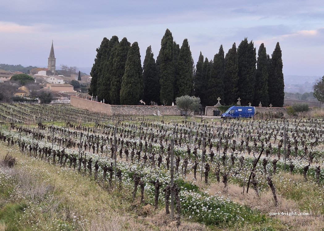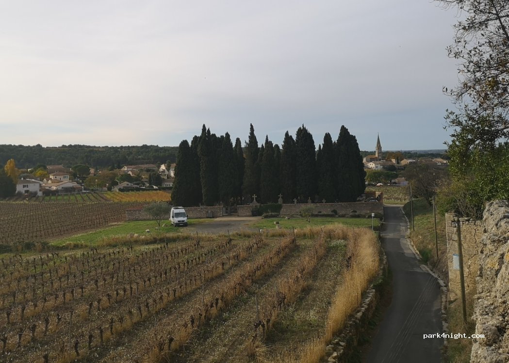spot tranquille sur le parking du cimetière. nos défunts sont des voisins qui ne font pas de bruits. par contre 1 second camper à 2h.du matin c'est pas bien, avec une installation bruyante. attention toutefois le chemin est très étroit seul les vans et petits véhicules peuve circuler. Merci à la municipalité qui tolère le parking des campers