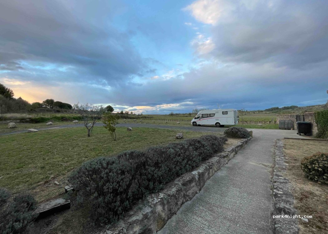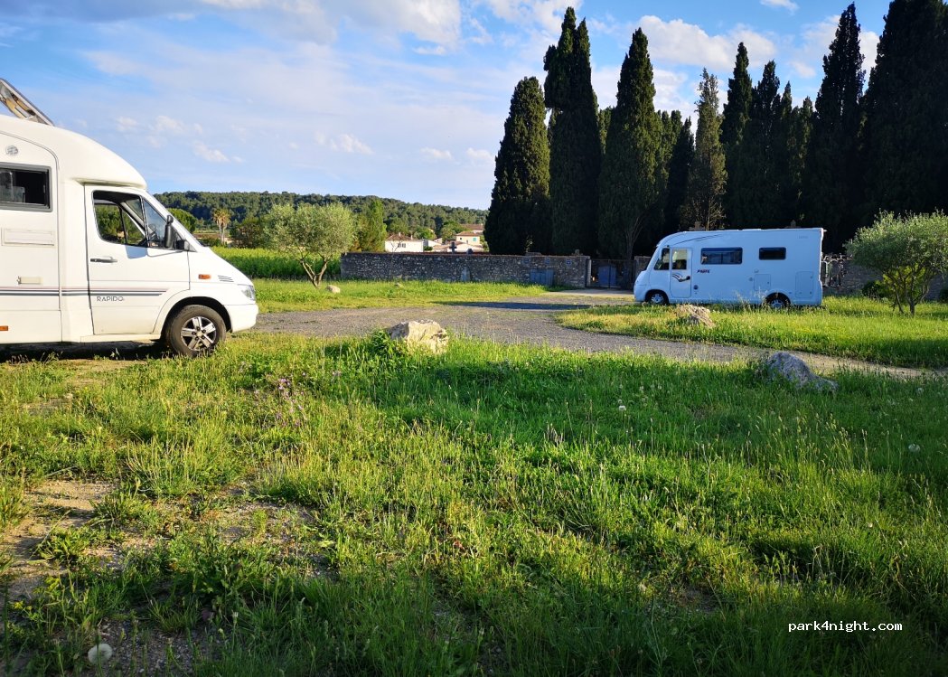 En pleine nature, au calme, derrière le cimetière. Très peu d’ombre juste en fin d’après midi derrière les hauts cyprès… Terrain légèrement penché… Accessible aussi par le village mais pour fourgons maxi 7m. Esprit tranquille pour balader les animaux. Eau dans le cimetière et au village (à 400 m environ) ainsi que des toilettes près du parc de jeux pour enfants. Idéal pour une nuit.