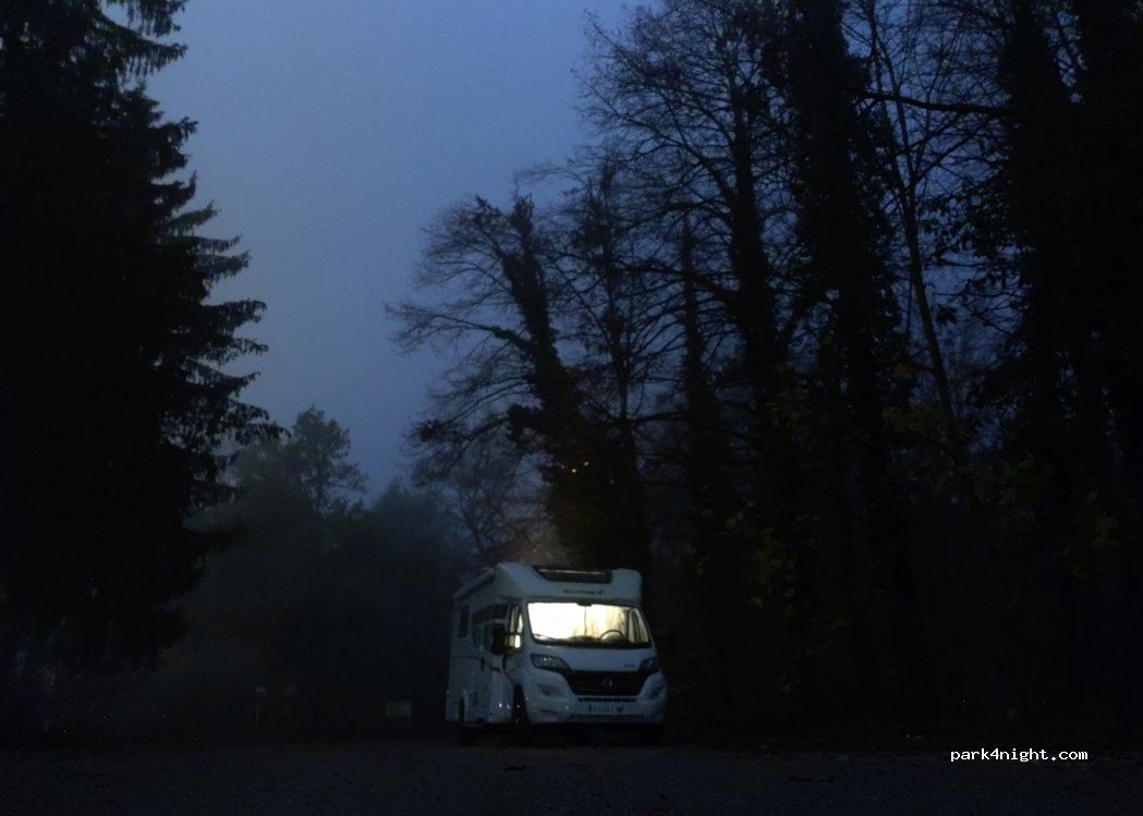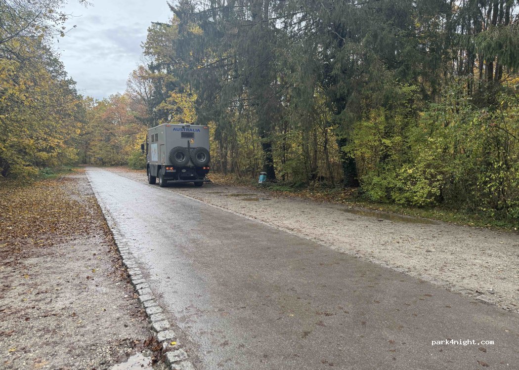 Parking in the middle of the forest for trail exit. 2 minute walk to the train station towards Munich. There is no camper ban.