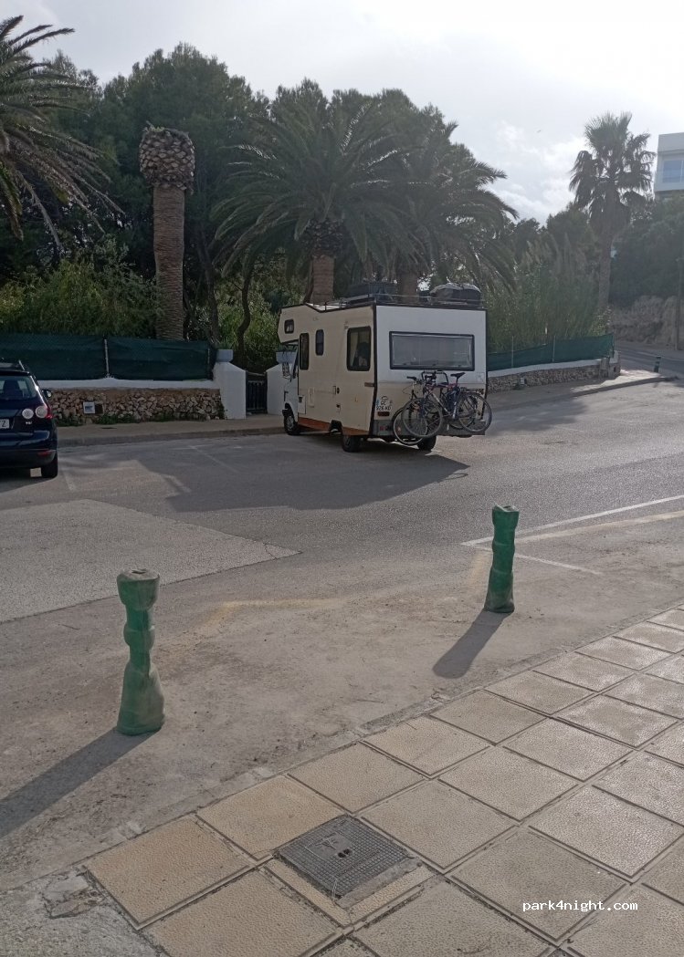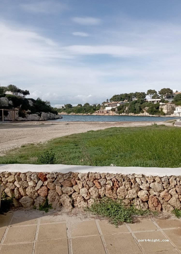 Pequeño parking, vacío fuera de temporada, en verano muy difícil a parte de que pasan muchos coches y camionetas de reparto durante la jornada. Ducha, acceso al baño actualmente cerrado, solo funcionan en verano, igual que los restaurantes de alrededor. Posibilidad de picnic en la playa, cerca de ciudadela y Cala Blanca