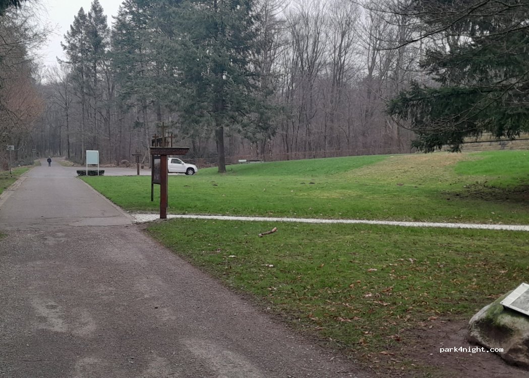 Public parking lot surrounded by forest at a soldiers' cemetery.