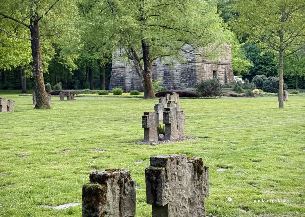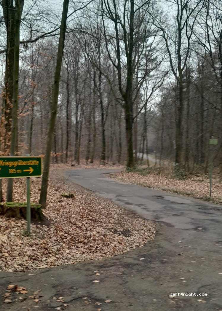 Via de Wasserweg de Poststrasse in met een verbodsbord voor vrachtwagens. Het is gelukt maar het was nipt. Super smal met veel tegenliggers die in een uitvoegstrook moesten gaan staan. Rij langs de Heidestrasse dan heb je geen probleem. Het was rustig staan. mooie boswandeling gedaan. Er komen wel veel auto's parkeren voor hun hond uit te laten. Je staat langs een mooi verzorgd militair kerkhof.