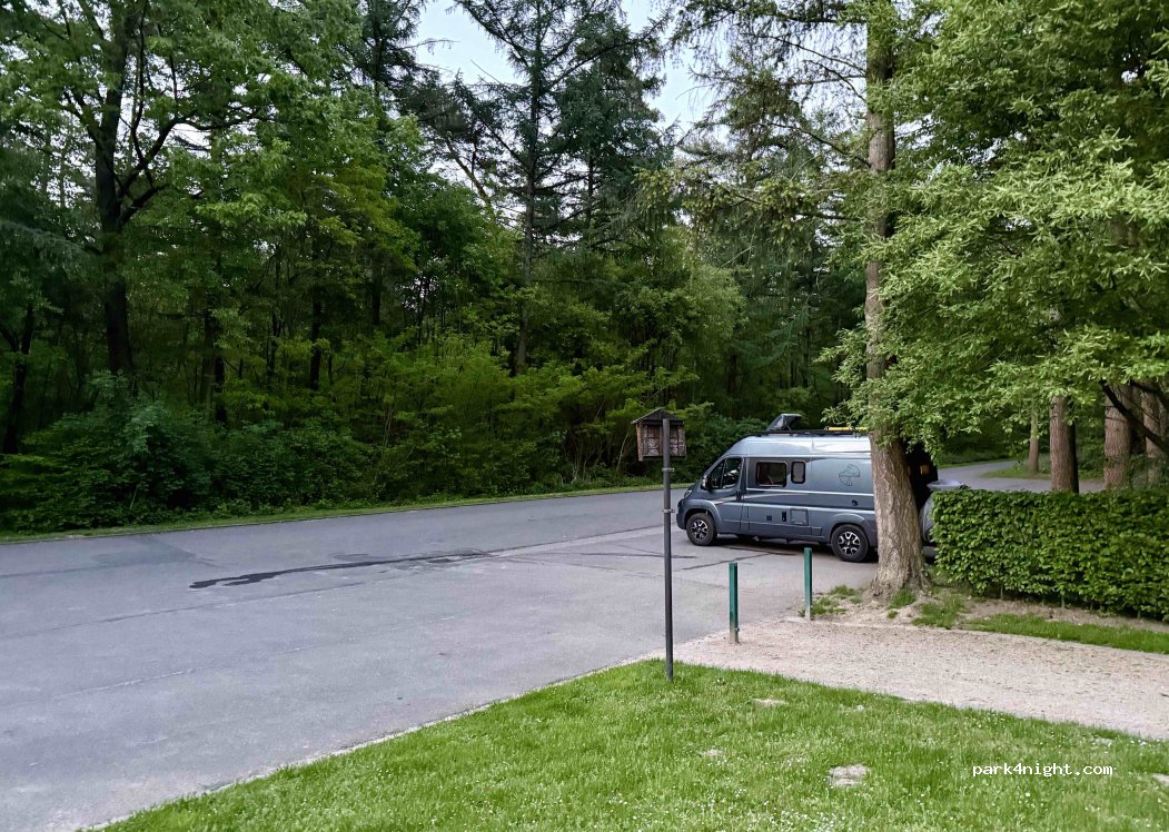 Geweldige plek, heerlijk rustig in bosrijke omgeving. Vlakke ondergrond. Geen doorgaande weg, alleen mensen die komen wandelen of de begraafplaats bezoeken. Zou dus vol kunnen staan maar wij stonden er alleen. Geen voorzieningen alleen wat prullenbakken en een picknicktafel.