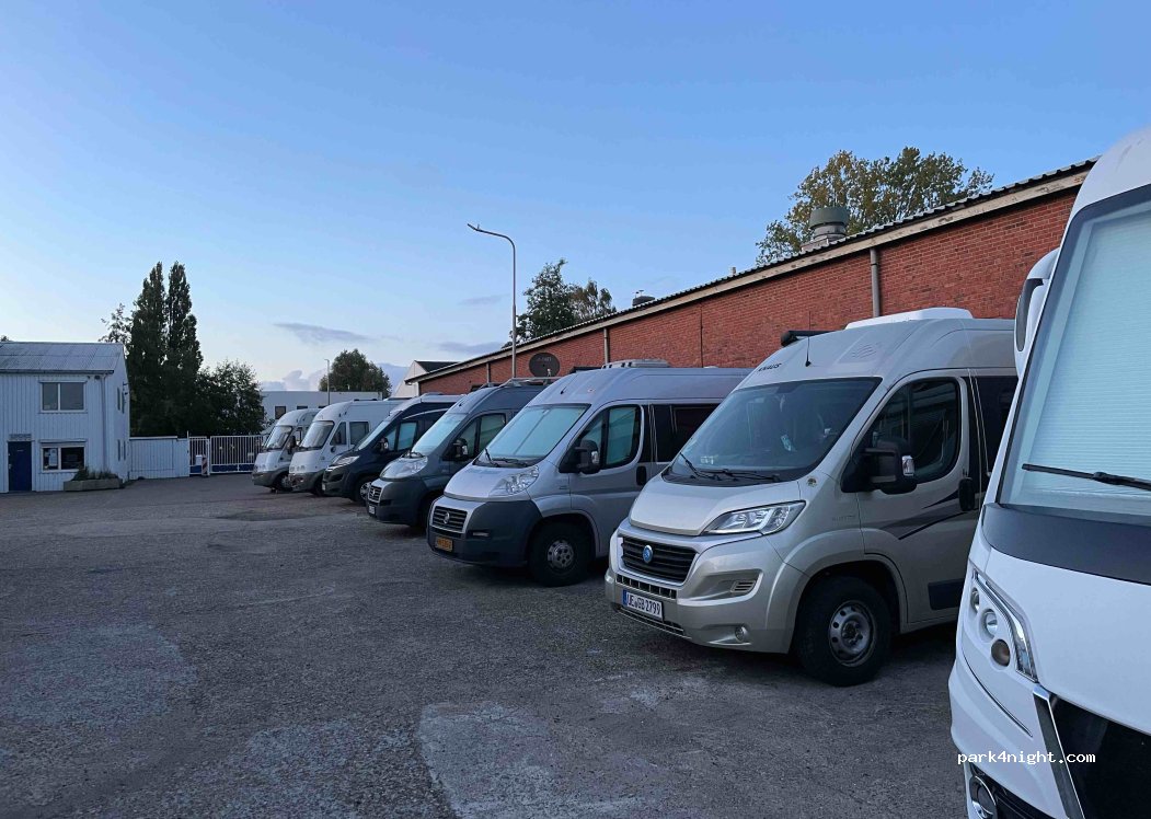 You park in a rustic shipping yard. There are a gate and a code so you are secure at night. Not that far to the city but we didn't try to walk there. You get electricity in the price and that was what we wanted this night. For 3 persons the cost is €20 and it's OK but a bit high for what you get. We liked the spot but, if you are here on a normal day and plan to sleep longer then 7 o'clock, then you'll have to stand all the noises around in the yard.