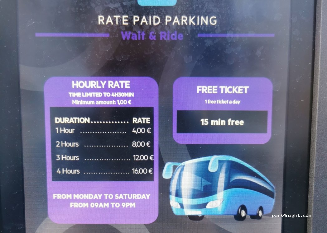 Nous avons payé 7€ pour 3 heures. Idéal pour visiter la ville car situé au centre. un homme bizarre tournait autour du fourgon je suis resté surveillé mais il est parti. Je suis venu vérifier une fois que tout allait bien. Un terrain de basket et pissotiere à proximité.