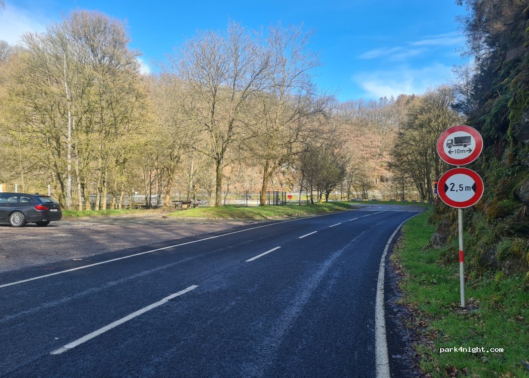 Bel endroit pour y passer la nuit,un parking en bord de route mais comme il y a un feu rouge pour le passage du pont,les quelques voitures (moins de 10 à l'heure en journée)qui passent roulent doucement... parking un peu en pente dans partie basse,un peu mieux dans partie haute...j'y repasserai...