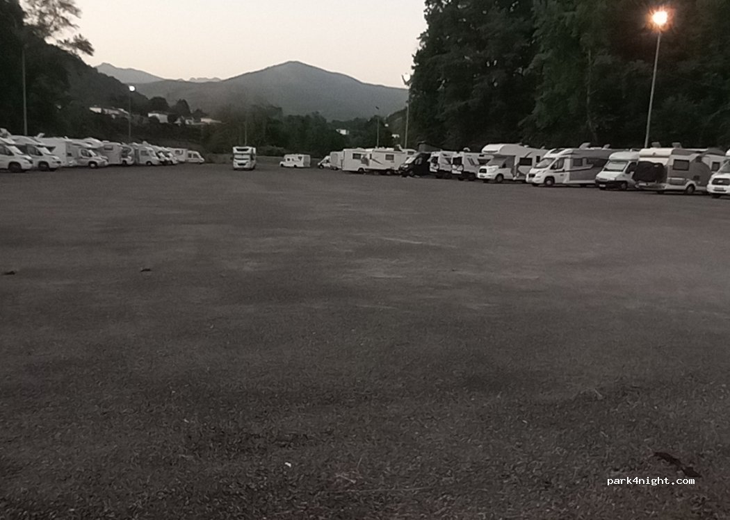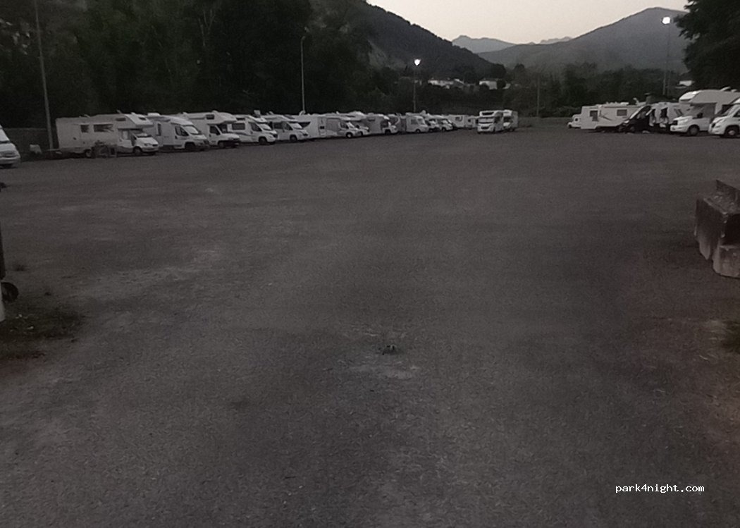 Vaste parking sur bitume gravilloné, au bord du Gave. Nuit calme, loin de la route. Barrière avec gardien dans la journée. 10 € 2.50 pour vider 2.50 pour remplir.