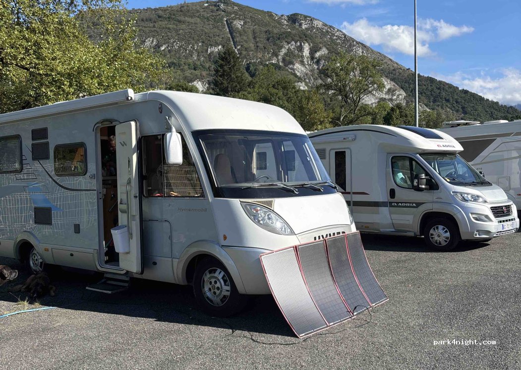 Parcheggio custodito giorno e notte per camper e pullman (due zone separate) su asfalto e in piano. Pattumi liberi e carico/scarico a pagamento. Reception aperta 24h!! Comodo a Lourdes, circa 10/15 minuti a piedi. Comoda la flessibilità nel pagamento (10€ solo area sosta, 15€ con CS).