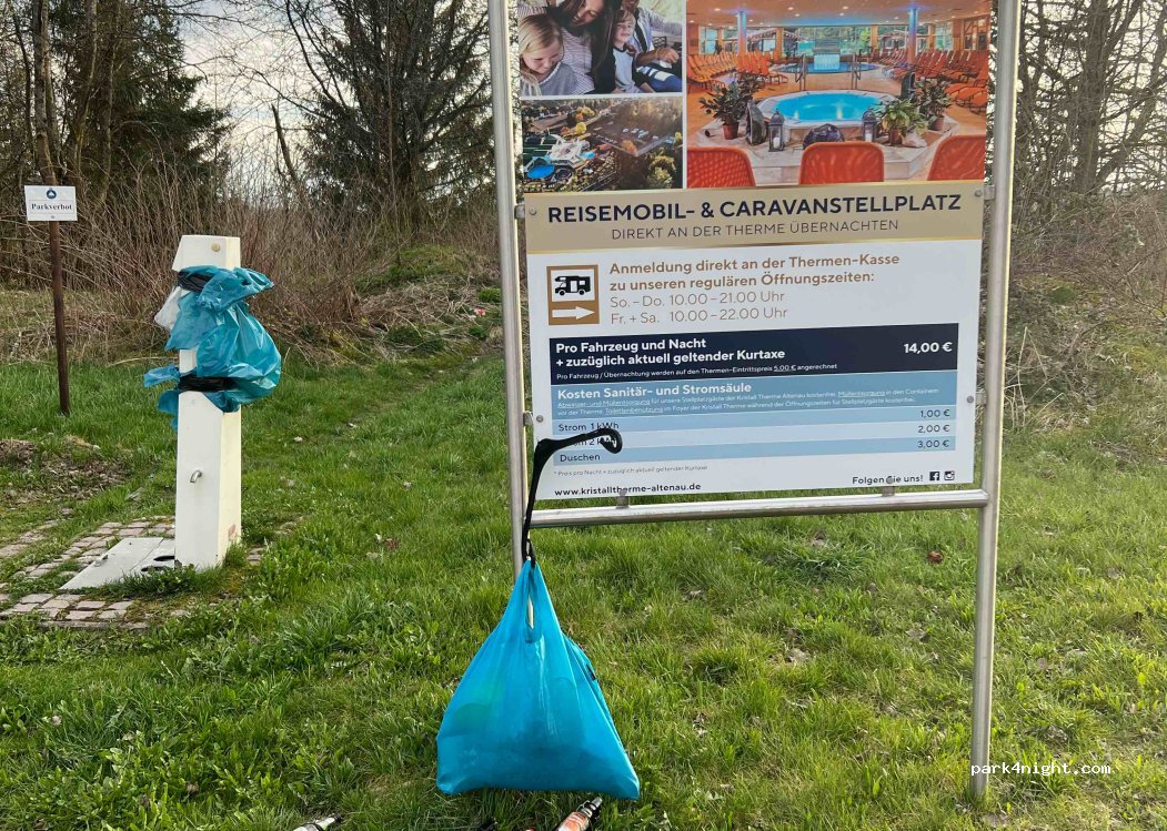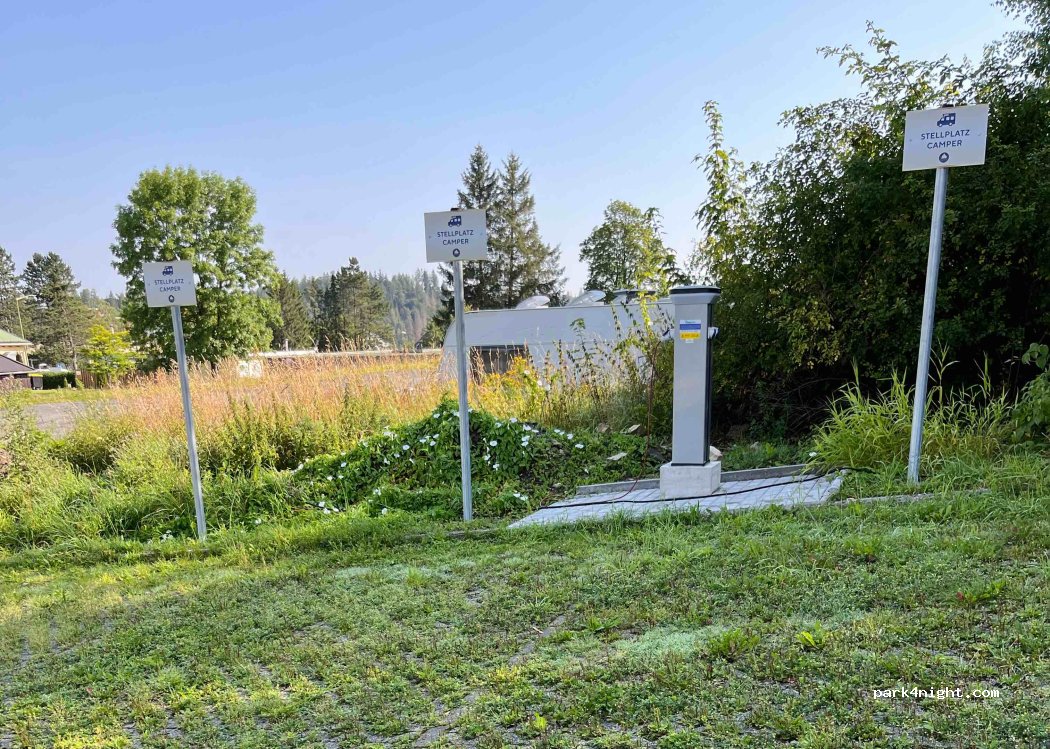 Parking space directly at the thermal baths, payment in the thermal baths, electricity via column with €0.50 coins, toilet during the opening times of the thermal baths.