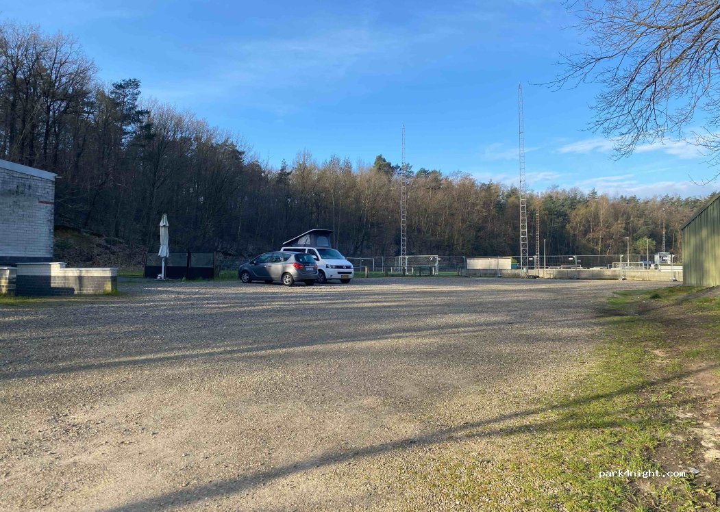 Quiet and spacious P next to sports fields on the edge of the forest. Athletes have another P, so only when it is full do the athletes move here. Other than that, hardly anyone comes here. Lots of birdsong and a little car traffic in the background. No amenities. Also long campers possible. Take the dead end to the militia (which is no longer in use). You walk or cycle. straight into the woods here.