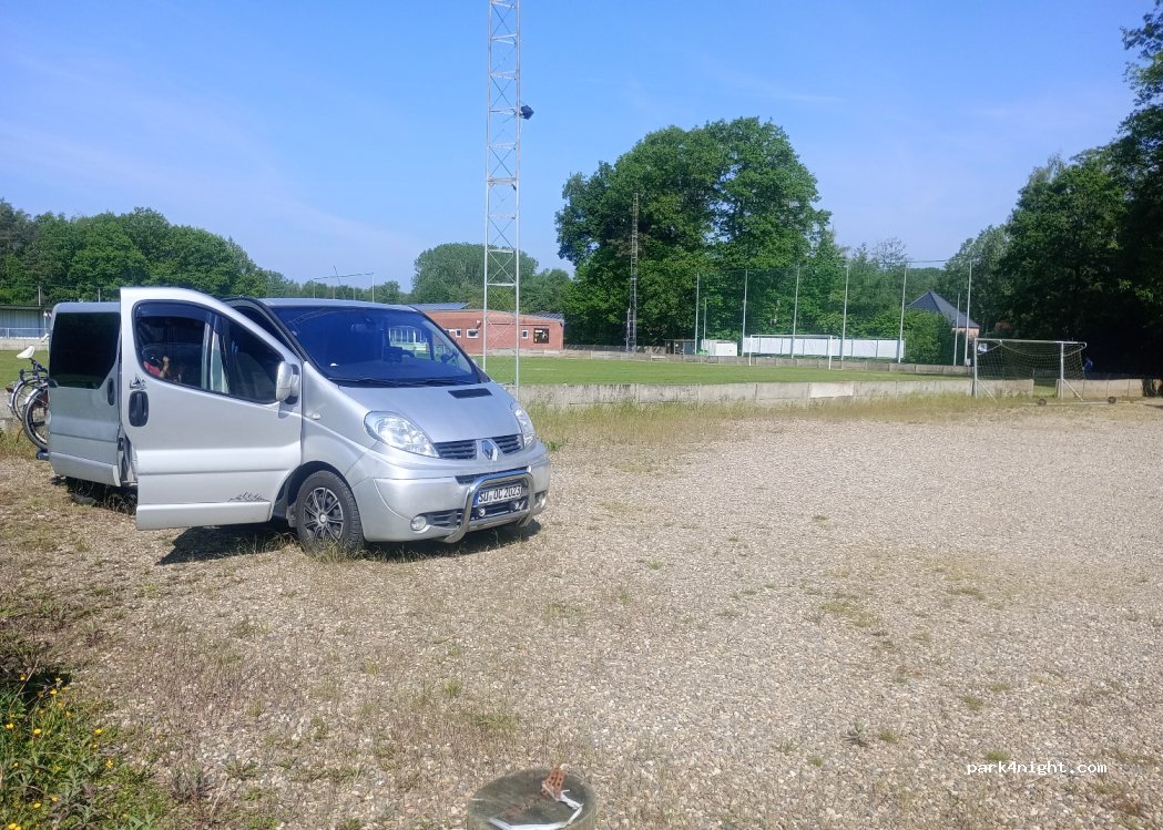 Ruhige und geräumige P neben Sportplätzen am Waldrand. Athleten haben ein anderes P, also bewegen sich die Athleten erst hierher, wenn es voll ist. Ansonsten kommt kaum jemand hierher. Viel Vogelgezwitscher und ein wenig Autoverkehr im Hintergrund. Keine Annehmlichkeiten. Auch Langcamper möglich. Nehmen Sie die Sackgasse zur Miliz (die nicht mehr verwendet wird). Sie gehen oder radeln. hier direkt in den Wald.