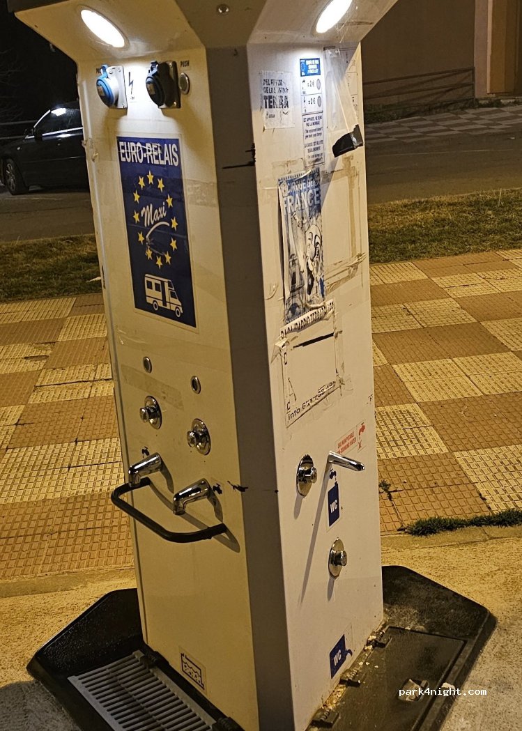 The machine is located on the central promenade. You can fill water and empty the toilet. There are electricity points, but I don't know if they work.