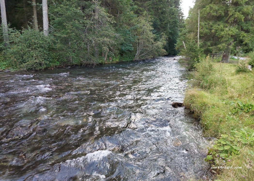 Large, wide, gravel parking lane (1.5 cars length in parallel parking) on long stretch next to side road with very few traffic. Last stop on a walking trail route. Beautiful scenery with pine trees, close to a small village and a few steps away from a river. Benches available. Hikers, bikers arrive in the morning, there is also a bus stop. Quiet and calm, we were the only ones.