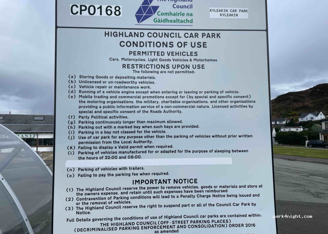 Large parking area without restrictions suitable for all size vehicles. Some lorries spent the night here too. Quiet overnight, some traffic and buses begin to pass by in the morning. Kyle of Lockalsh on the other side of the bridge is prettier but only suitable for small vans and with less places.