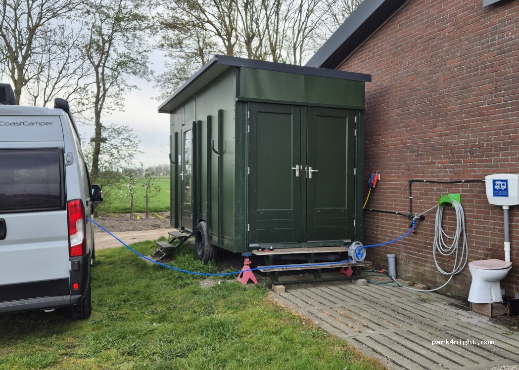 Boerderij, verharde plek beschikbaar voor gasten achter de schuren. Met mooi weids uitzicht. Zeer schone en moderne toiletten en douches. Mogelijkheid om zwart water te lossen en drinkwater te laden. Ze hebben geen putdeksels voor grijs water.