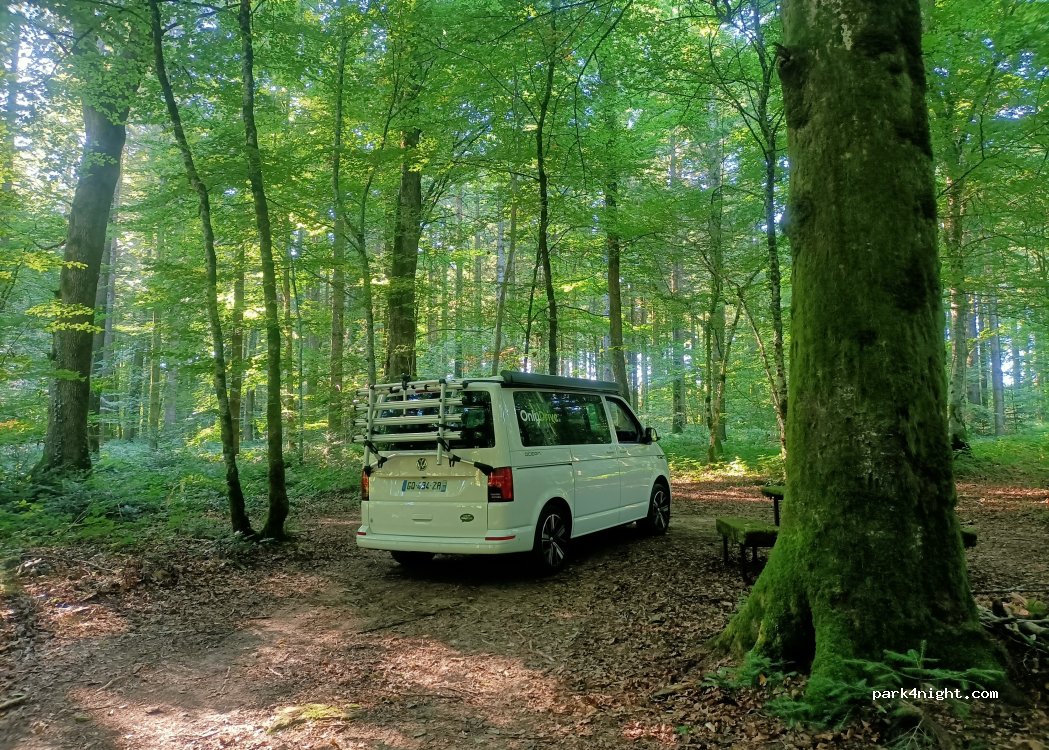 En pleine forêt, à 30metres de la route, pas de passage la nuit.