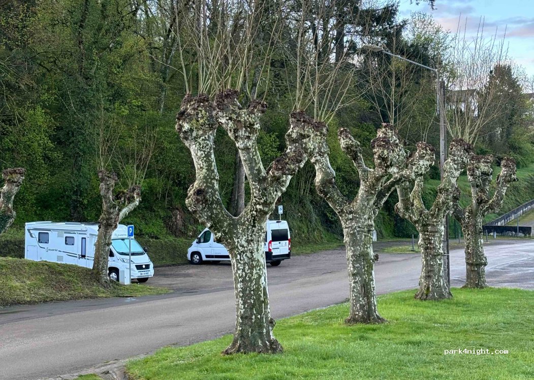 Very good for overnight parking. Quiet on the weekend. Pictures with the four trees aren't correct these are from another parking lot.