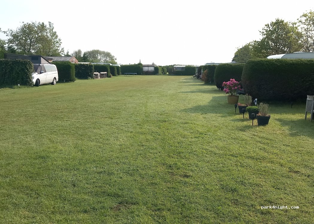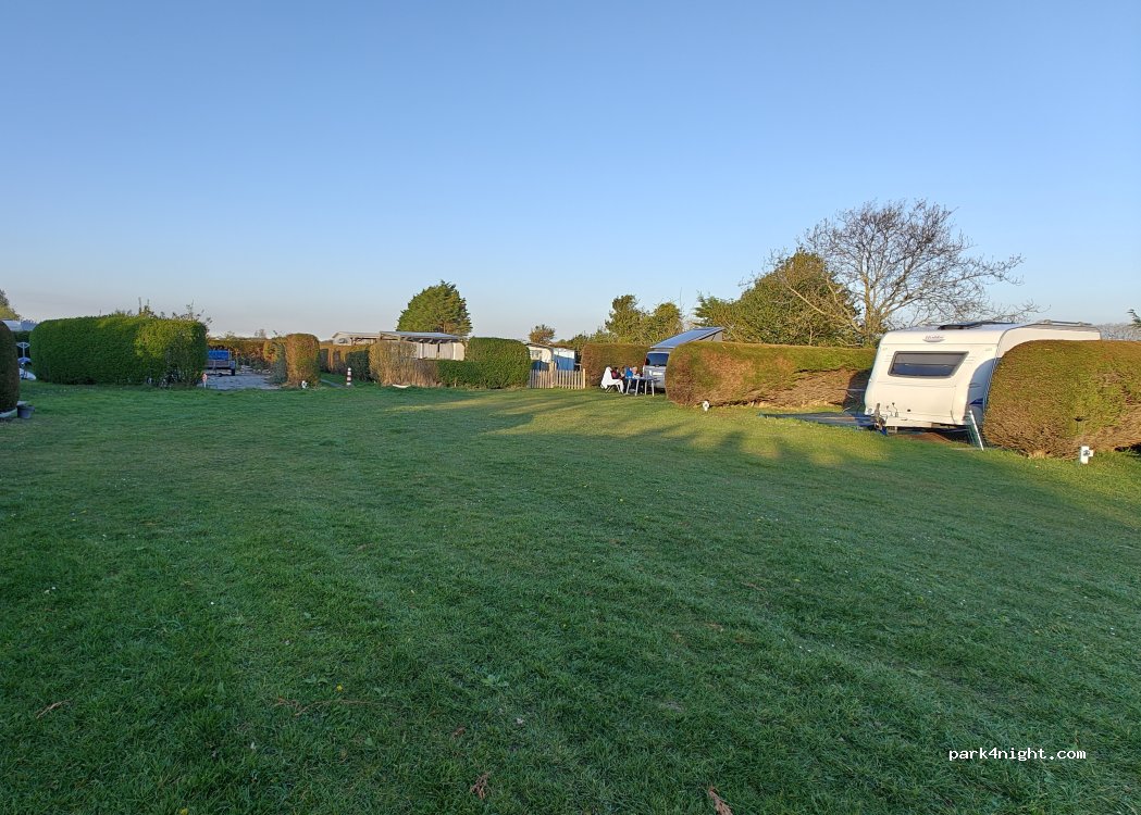 Espace très agréable car très vert avec des haies qui donnent un aspect cocon. Sentiment isolé des champs et de l'extérieur. Paisible. Sanitaire très ancien permettent de faire le nécessaire. Accueil pas facile car la personne ne parle pas l'anglais. 35€ pour un adulte et un enfant avec électricité dans un véhicule aménagé. 1.25€ par douche.