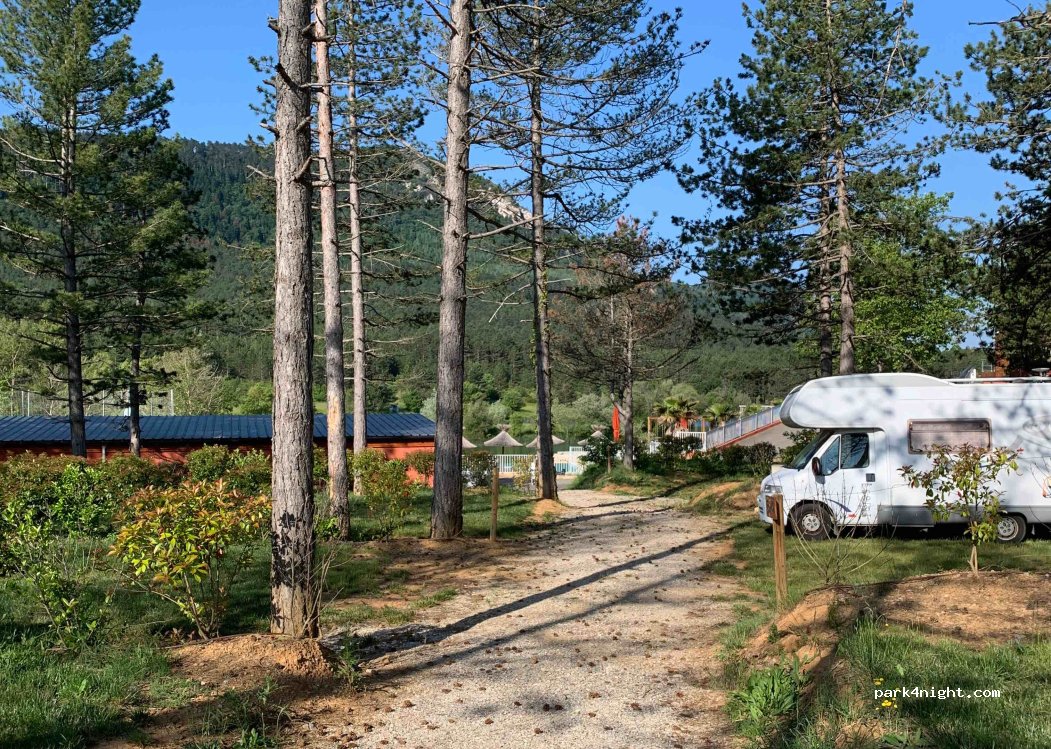 - Om de staanplaatsen te bereiken, richting Villeneuve-Laure, gaat u rechtsaf na het kruis en vóór de cipressenhaag. Let op, de ingang is smal; u kunt het beste vanaf de richting Laure-Villeneuve komen.