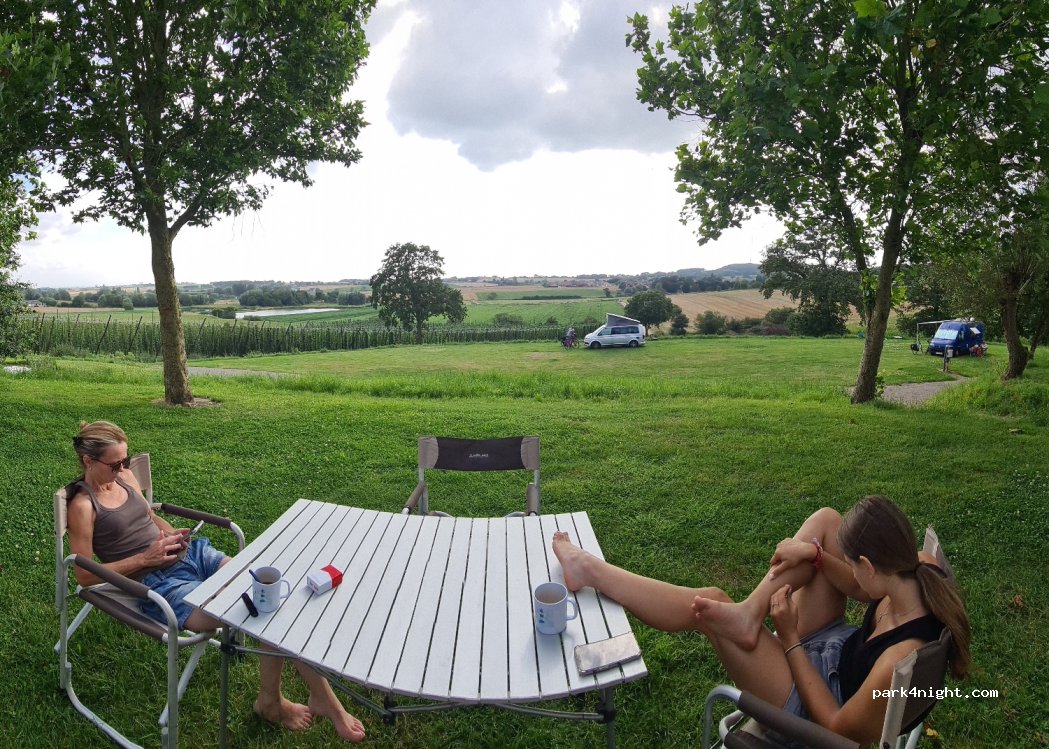un superbe camping " a la ferme", avec une vue imprenable sur les houblonnières, si le gerants n'est pas la ( l'accueil est dispo de 12h30 a 13h et de 18h30 a 19h) installez vous et vous paierez quand il sera la. ne cherchez pas une animation, on y va pour le calme. a pied on peut aller au mont noir a 2,4 kms par de petites routes. nous avons payé 20 euros la nuit avec sanitaires et electricité