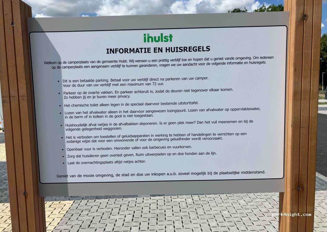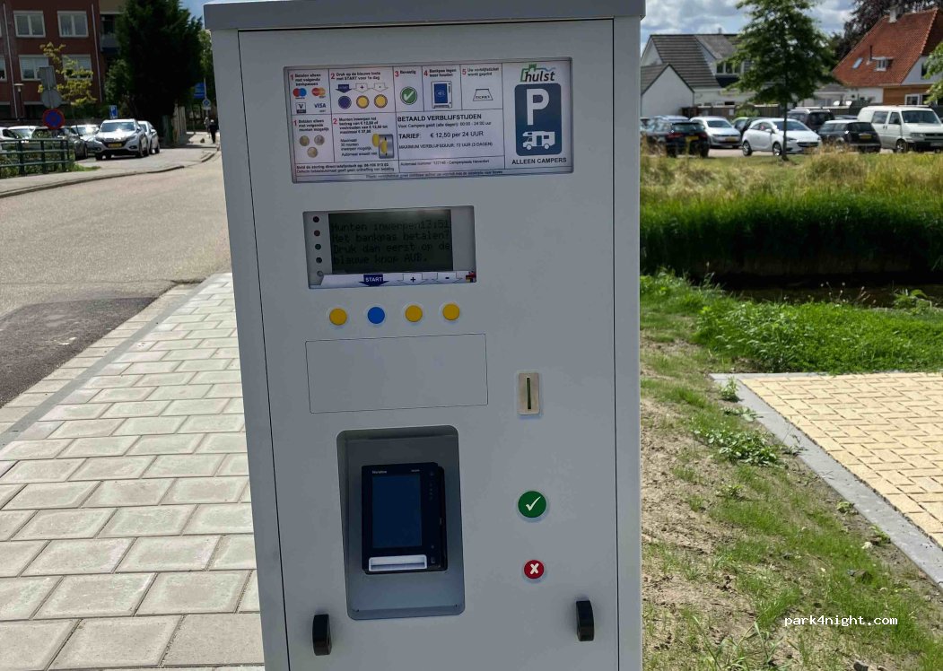 Nice spot to park up, close to one of the original gates into Hulst with a nice walk around the old earth wall. Supermarkets nearby 3-5 minute walk. Good size hardstanding pitch,designed with space between vehicles also rubbish, and services. Issue for us it apoears the payment machine does not take non EU debit or credit card, so needed coins.