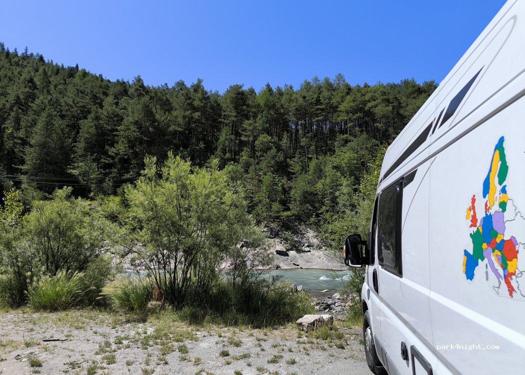 Super spot!!! En bord de torrent, bercés par le bruit de l’eau. La route n’est pas très loin mais le bruit est couvert par les remous. Ombragés, plusieurs spots sous les arbres. Possibilité de s’installer directement au bord du torrent. À plat, très fréquenté, de jour comme de nuit. Ce dernier point serait son unique défaut mais on s’y est sentis vraiment très très bien.