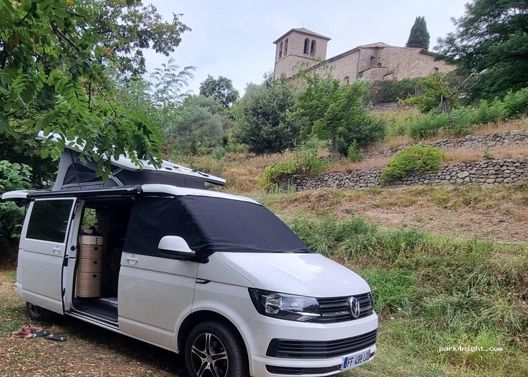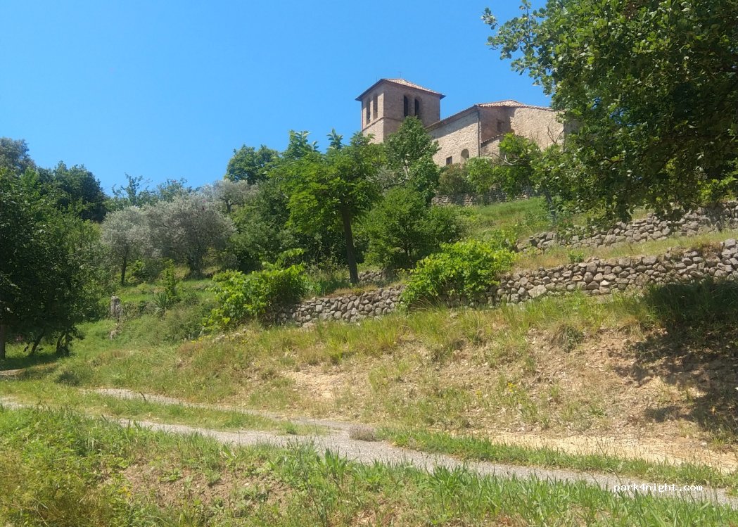 Route d'accès assez étroite, le terrain est plat et assez ombragé en fin de journée ; la route en contrebas est assez bruyante et il n'y a pas de point de vue car la végétation s'est développée ! Un point d'eau et des toilettes au niveau de l'église (très belle, il faut la visiter !) mais attention : classée Monument historique, on n'a probablement pas le droit de camper sur le parking...