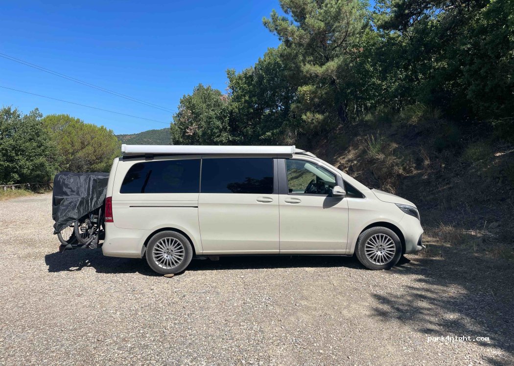 Très bon parking au calme dans les hauteurs avec une vue absolument magnifique. À noter que 1. la route pour y accéder est assez étroite et à double sens donc prudence avec un gros véhicule ; 2. nous avons du rentrer en marche arrière avec notre 6m50 car le virage de l’entrée est serré ; 3. il est assez difficile de trouver un emplacement à plat sans cales