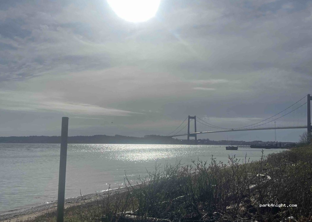 Ruhiger Stellplatz in der Nähe der Brücke. Perfekt für die Durchfahrt oder eine Nacht. Es sind Bänke und Tische direkt am Wasser, an einem kleinen Zugang vorhanden. An denen konnten wir mit Blick aufs Wasser frühstücken. Wer sich hier noch eine Weile ans Wasser setzt, wird auch mit hoher Wahrscheinlichkeit Schweinswaale sehen. mit uns 3 andere Camper da.