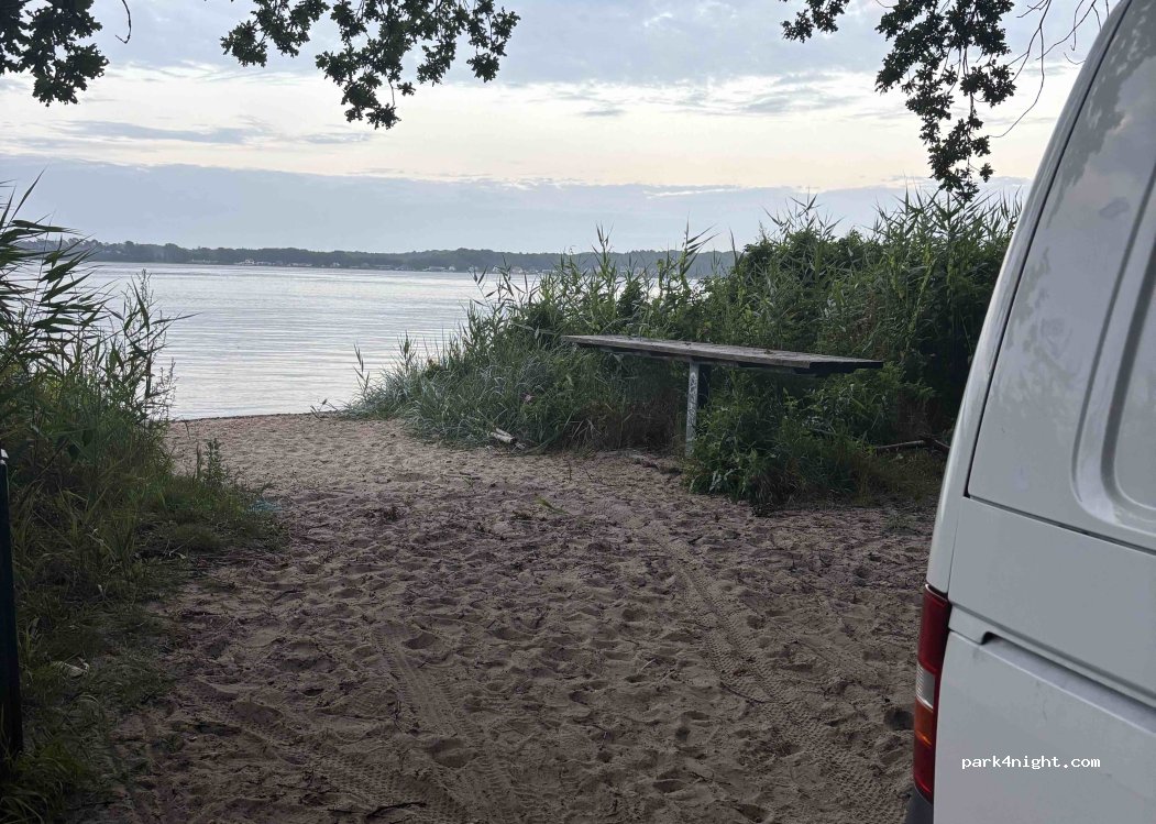 Toller, sauberer, relativ ruhiger Schlafplatz!Ein paar Meter weiter kommt eine Jugendherberge. Wir konnten mit dem VW Bus direkt am Wasser mit Ministrand, einigen Picknickbänken und Mülleimer übernachten.Direkt gegenüber ist noch ein kleiner Platz an dem ca. 3 stehen können.