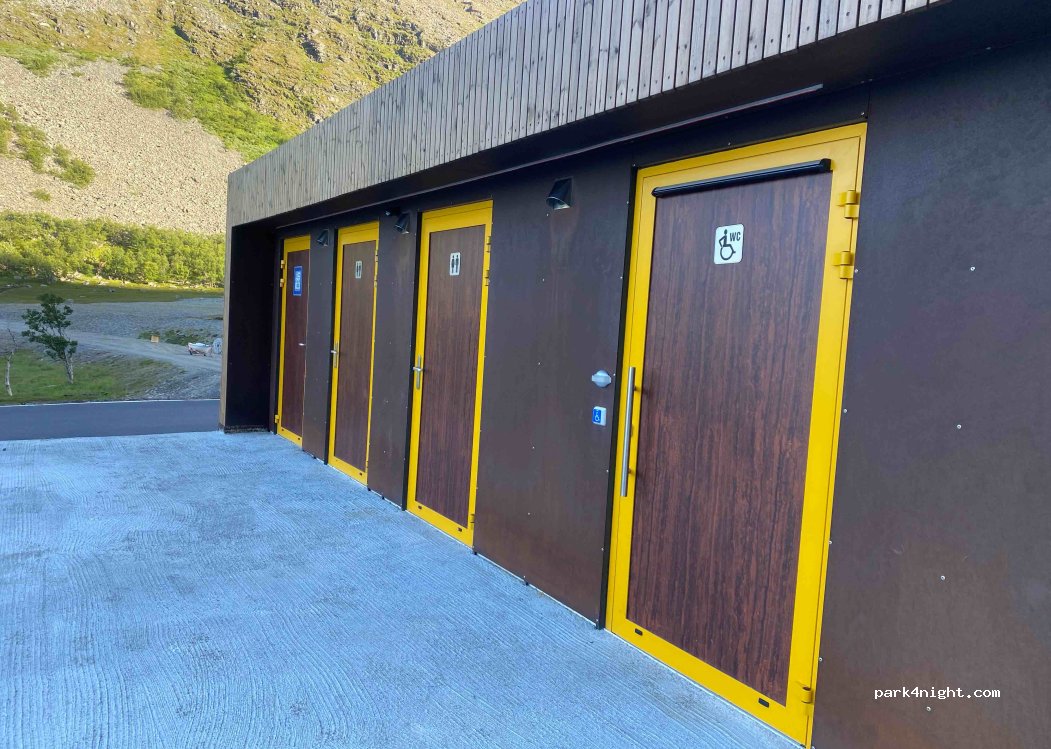 Excellent stop on the way to Nordkapp. Three clean toilets, black waste, asphalt parking, full when we stayed on the 2nd of June. We had virtually no phone signal. Reindeers wandering around at night