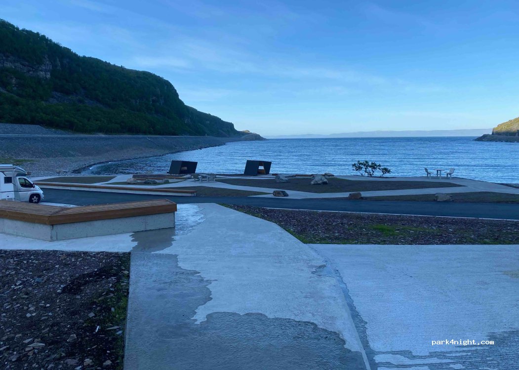 Abbiamo trovato questa area apposita per sosta camper semplicemente perfetta. Tutto nuovissimo. Piazzole grandi con spazi adiacenti da lasciare liberi per avere spazio di manovra intorno al camper (come nei campeggi!). Bagni pubblici puliti. Il tutto in riva a un fiordo. Ci sono panchine coperte per ammirare il paesaggio e anche dei bracieri per fare il fuoco. Difficile trovare posti migliori.