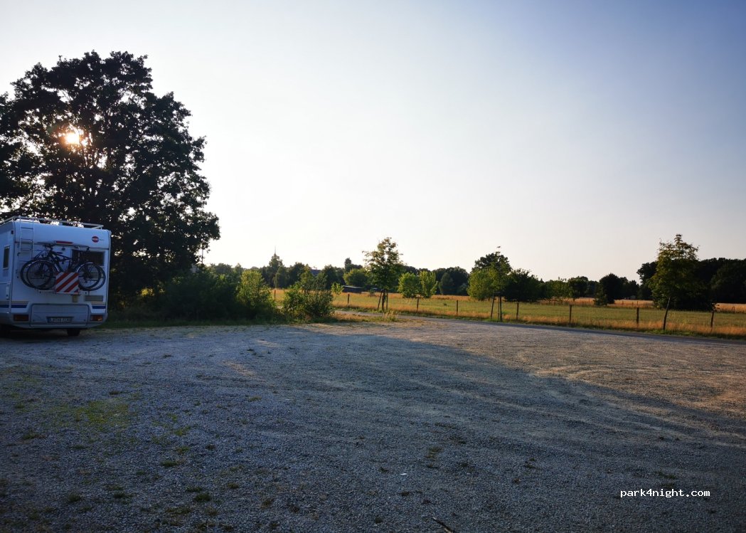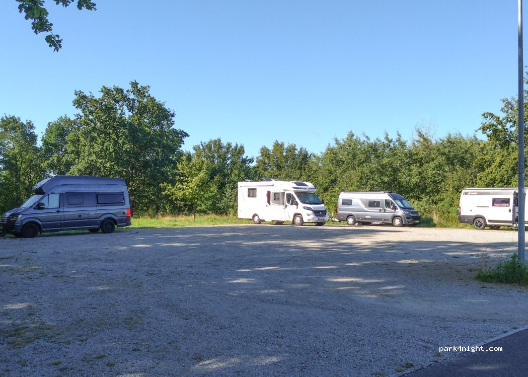Kiesfläche vor einem Badesee und vor dem offiziellen Seeparkplatz. Keine Verbotsschilder. Tagsüber von Einheimischen belegt, die Campingverhalten hier nicht akzeptieren. Leicht abschüssig am Rand.