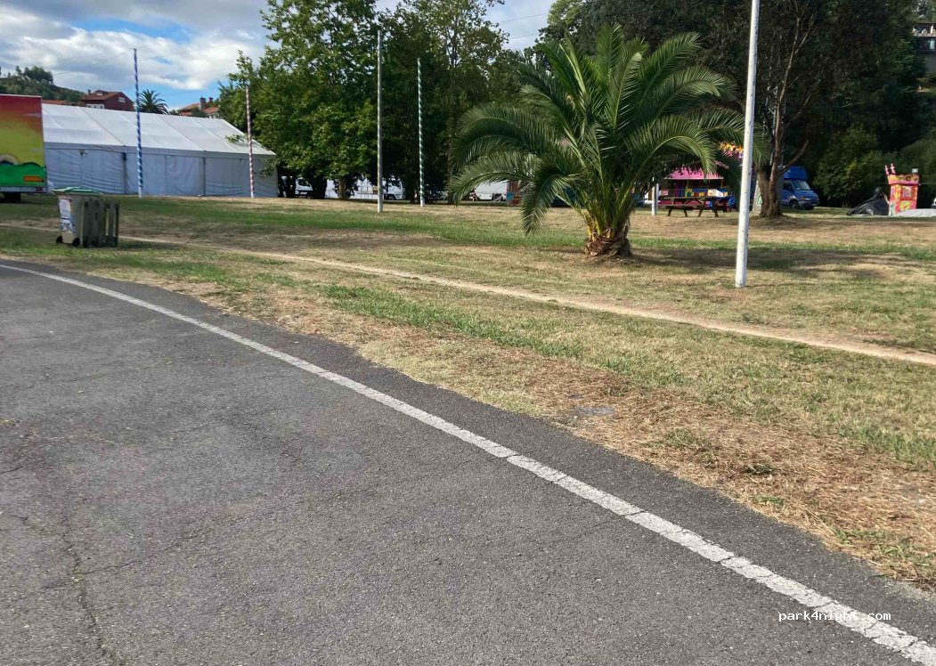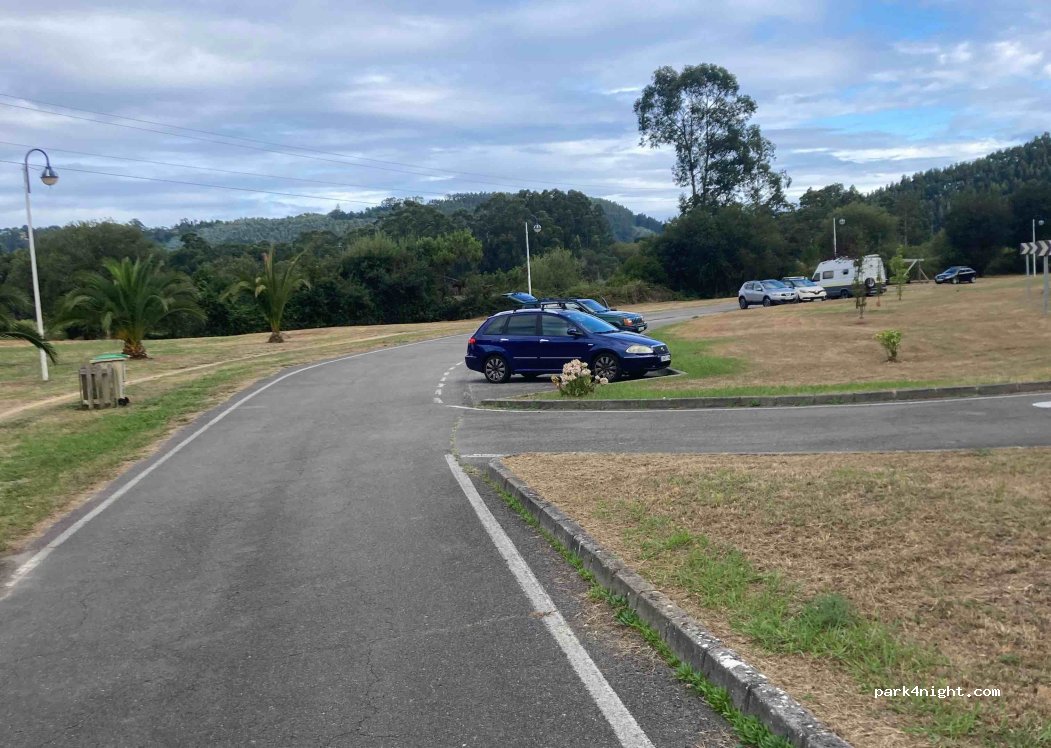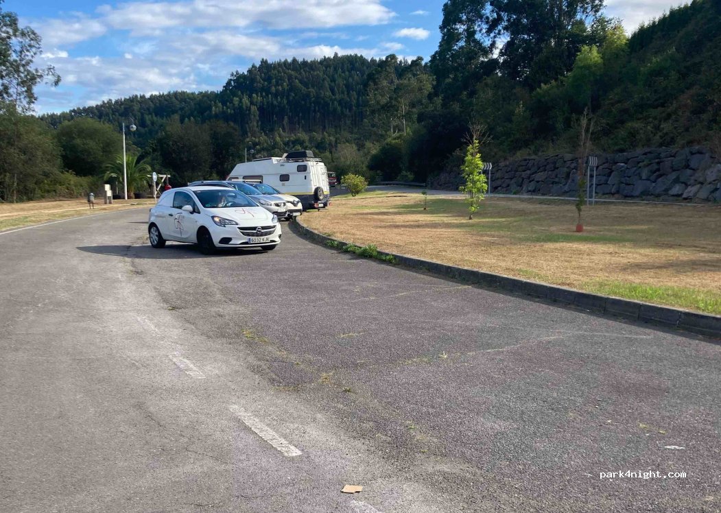 Parking for all types of vehicles next to a road. At night hardly a car passes with which you can rest. At the exit of the parking lot there is a fountain.