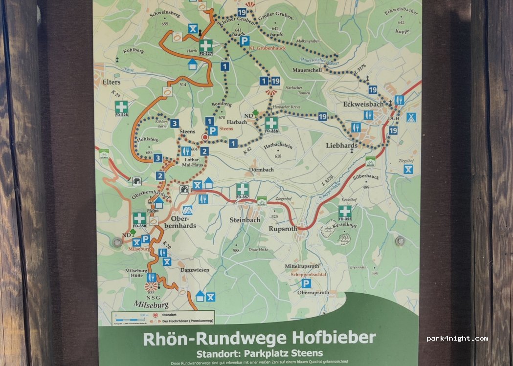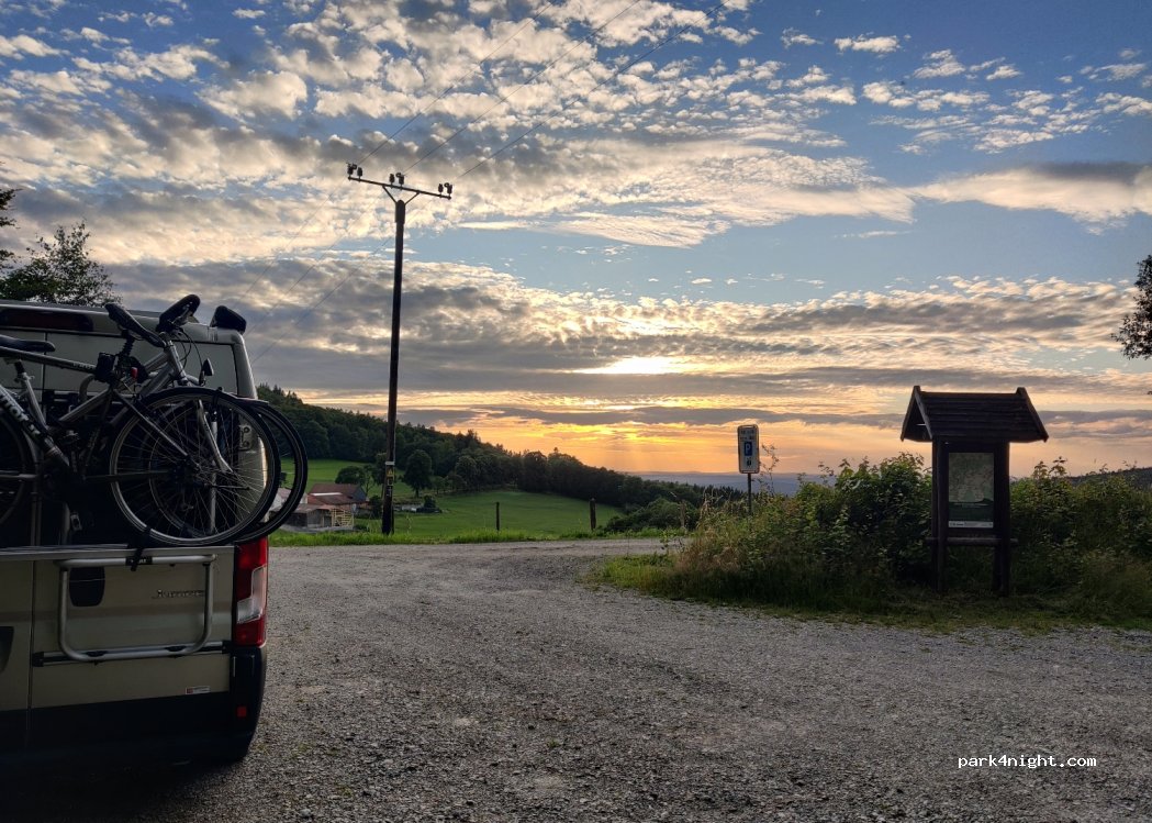 Sonniger, kleiner Wanderparkplatz "Steens" mit hübscher Aussicht. Einfache Anfahrt, parken auf Schotter, minimale Schräge. Wandertafel, Sitzgruppe, Müllkübel vorhanden. Tags etwas Bewegung, schöner Sonnenuntergang, nachts ruhig, dunkel. Viele Natur zerstörende Windkraftanlagen am Horizont. Aktuell etwas ungepflegt mit Schotterhaufen und hochem Unkraut. -Leave no trace, except your footprints-
