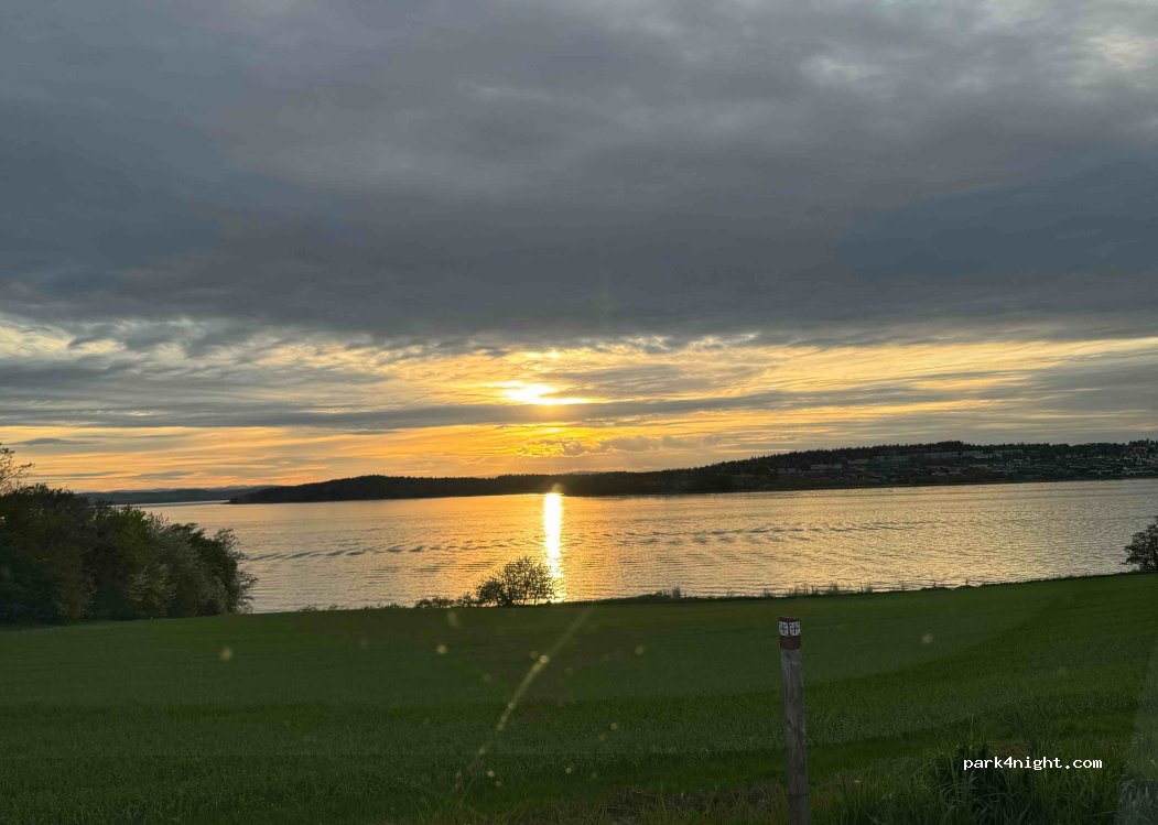 Small car park with a view of the fjord. a train passes right behind so check if it's noisy. a few hundred meters to the north is a very nice beach, popular until late because the sun sets there. it is possible to park along the road, always with a view or in the descent to the beach, a discreet van will find happiness, but it is on a slope. there are trash cans and toilets at the beach.