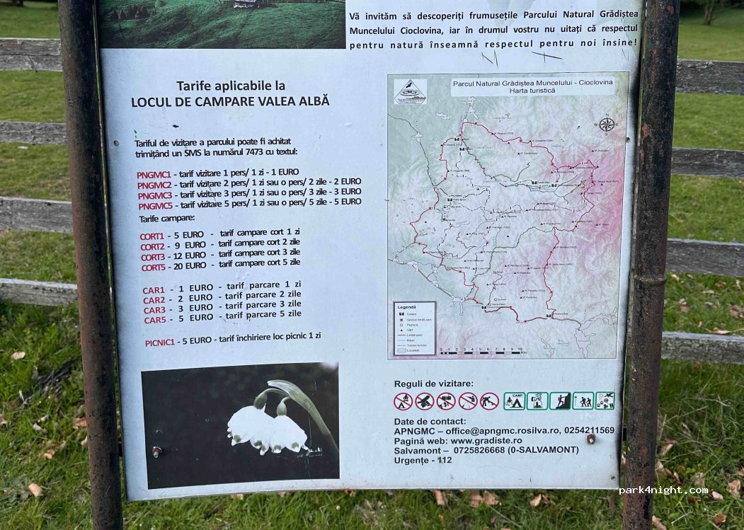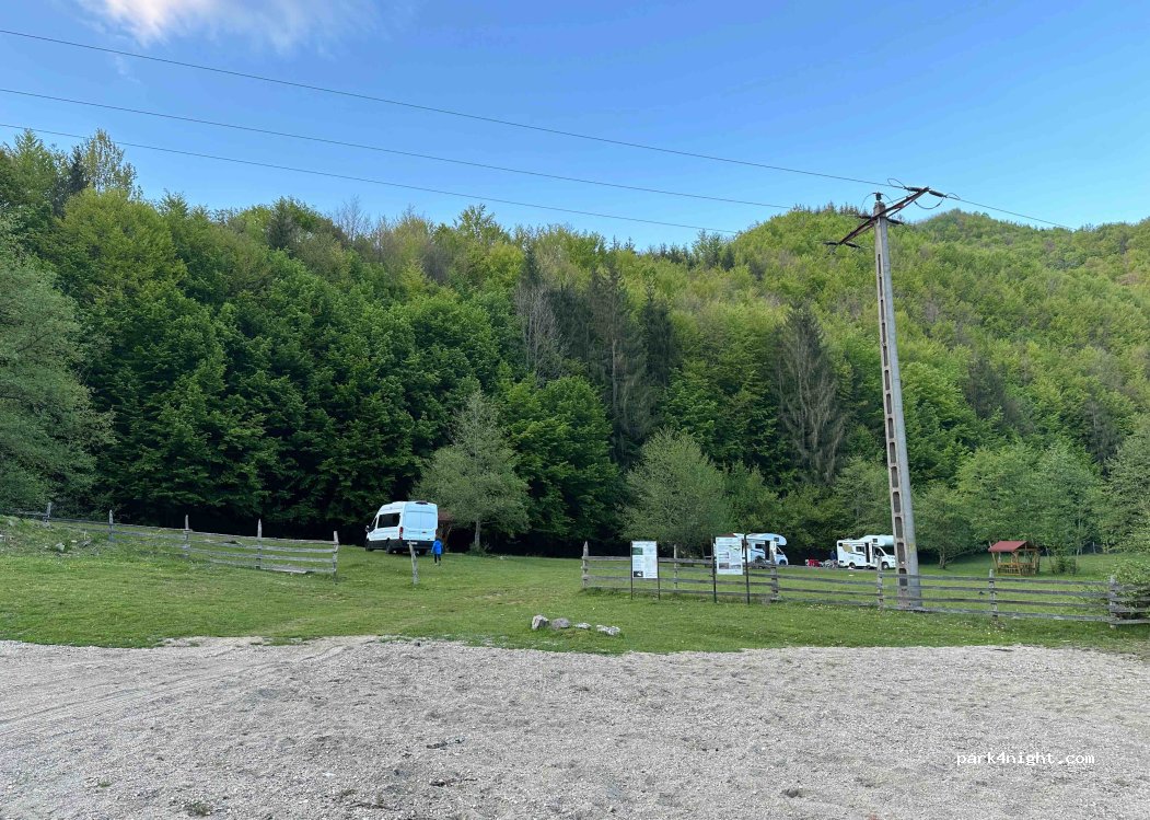A free campsite aside the asphalt road to Sarmisegetuza, with some basic toilets and a wide area, for caravans an tents. A small river is very near. There are springs with fresh water nearby, at few hundred meters. Quiet over night. The access is easy from main road, the ground is flat and green grass covered.