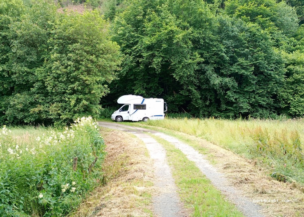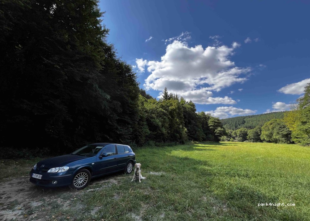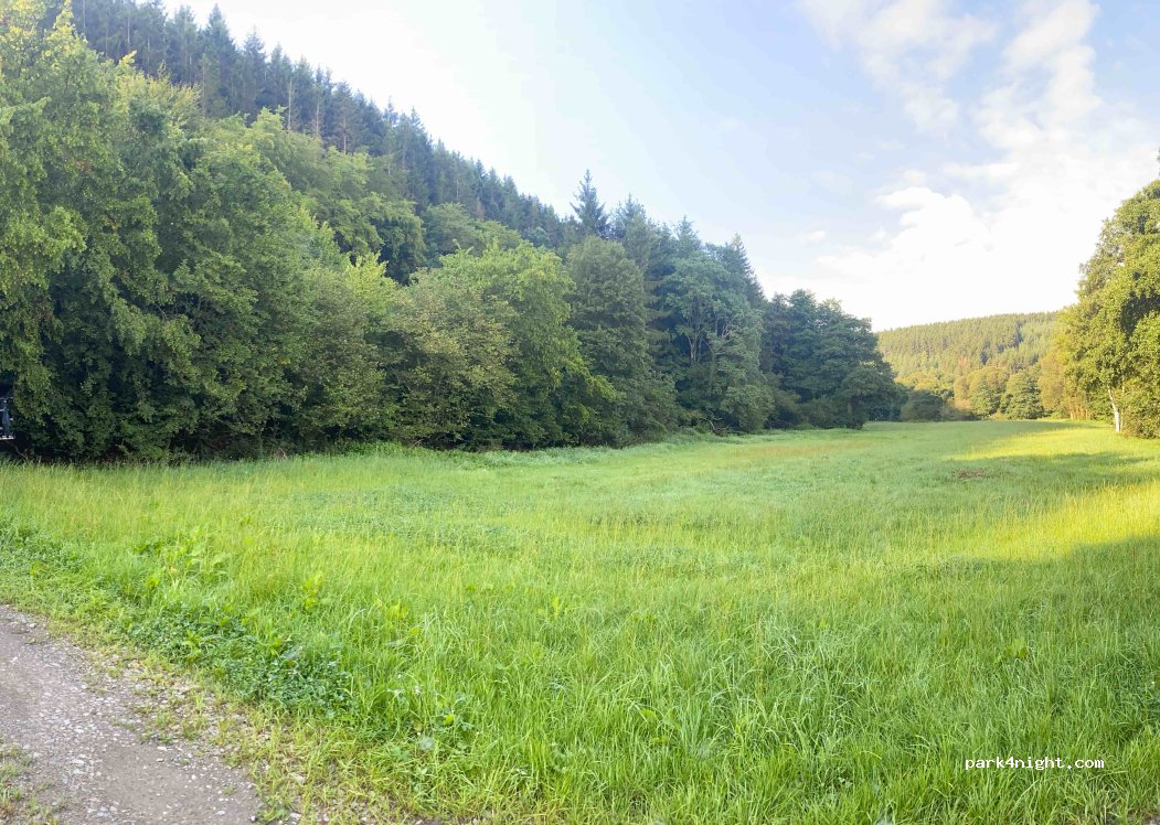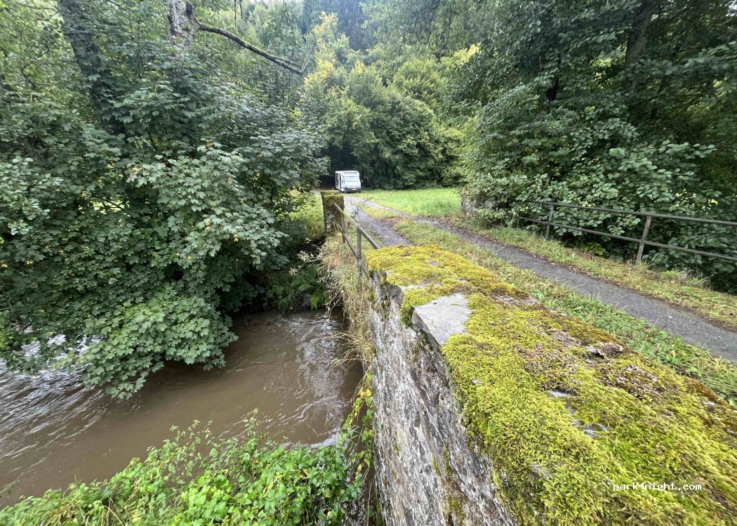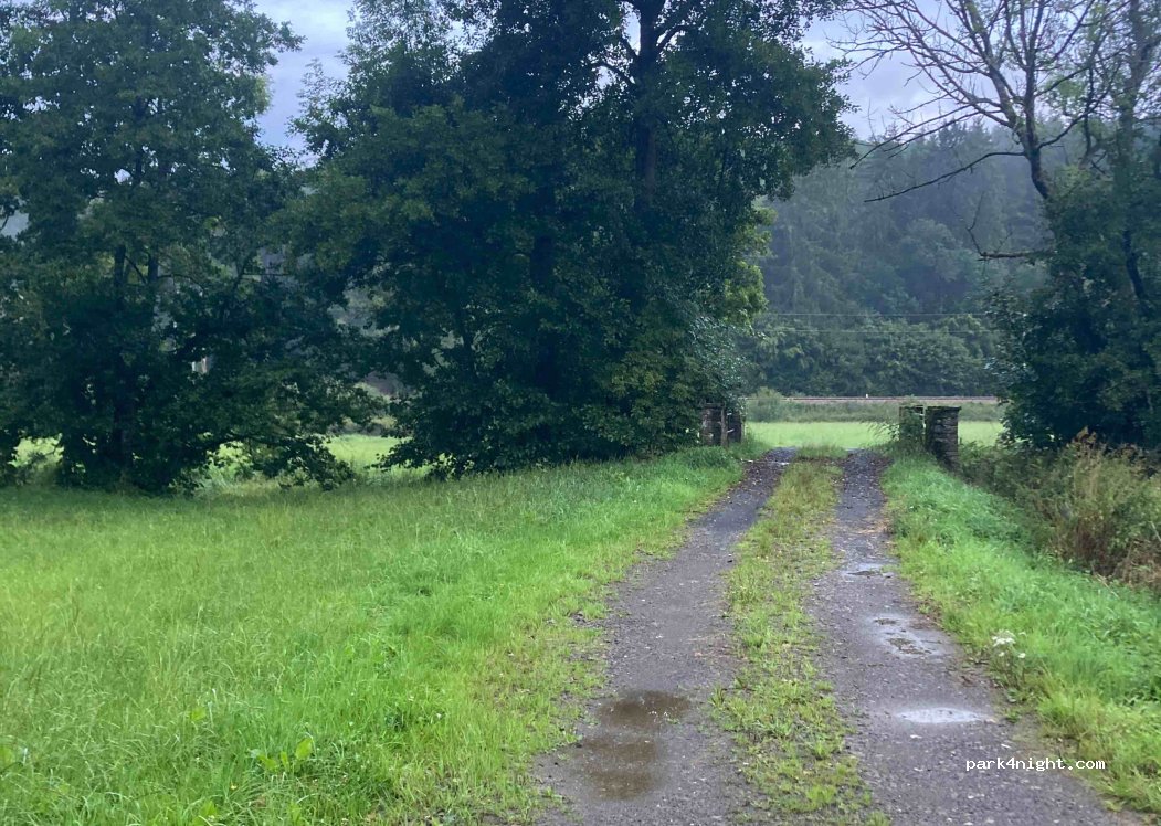 Plekje langs verlaten grindweg. Ideaal om dichtbij Clervaux te slapen. Wel vlakbij een weg (‘s nachts wel weinig verkeer) en treinsporen waar er bij ons vanaf 5u werftreinen heen en weer reden. Wel mooi uitzicht op weiden en riviertje.