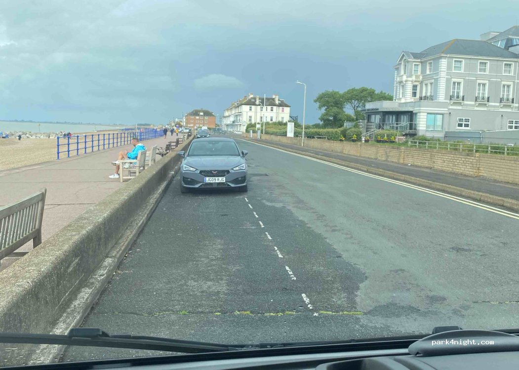 Parking on a road next to the sea and a stone beach. No restrictions. A better option is South Road which is nearby, next to the gardens and football area. It’s much quieter with very little passing traffic at night and lovely walks nearby.