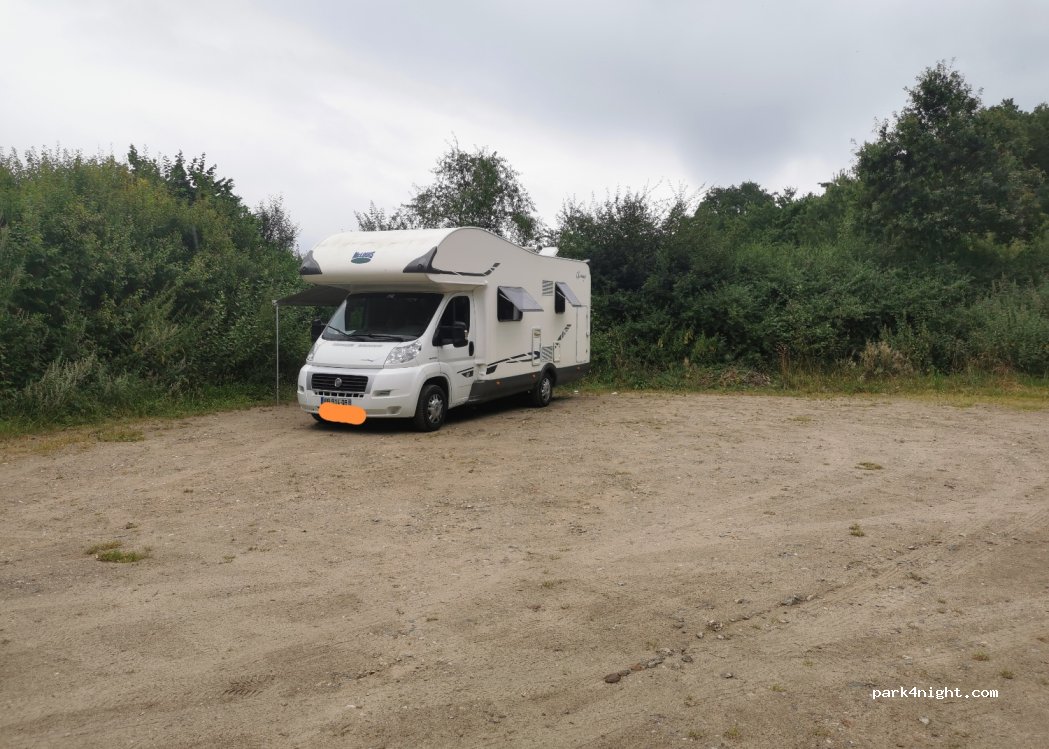 rustig gelegen parking, geen voorzieningen, enkel een bankje. gelegen aan doodlopende straat, omringd door weilanden, er ligt een treinspoor aan de zijkant maar wij hebben hier enkele dagen geslapen en enkel overdag passeert er heel sporadisch een trein zonder al teveel lawaai. op wandelafstand van een cafeetje waar je zaterdag en zondag 'Kuchen' kan eten!