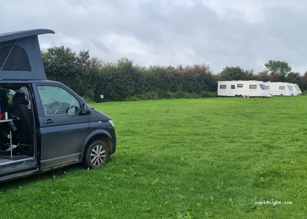 Most peaceful night. Just off peak, huge field with one other van. Firm after heavy rain at 7.5 long and 3.5 tonne, grassed unmarked pitches. Chocks and feet needed. Great for the dogs. Fill water tanks at the fire point PRIOR to entering campervan field as taps within are domestic no thread type. Grey water is UK type hose required. Narrow lane approach but everyone was courteous and thoughtful.