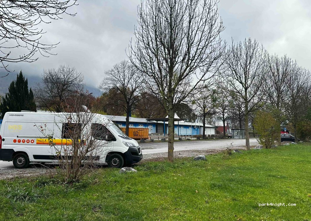 The parking lot is big, also on the field, so when the people from the pool are gone, you are there alone in the middle of the field, so its great. From 7am to 5pm you pay, but its pretty cheap and worth it +1 free hour. We slept there two nights, and it was great. No noise, beautiful river just behind that you can swim in and lots of mountain trails. Great for bikers, walkers or chillers:-)
