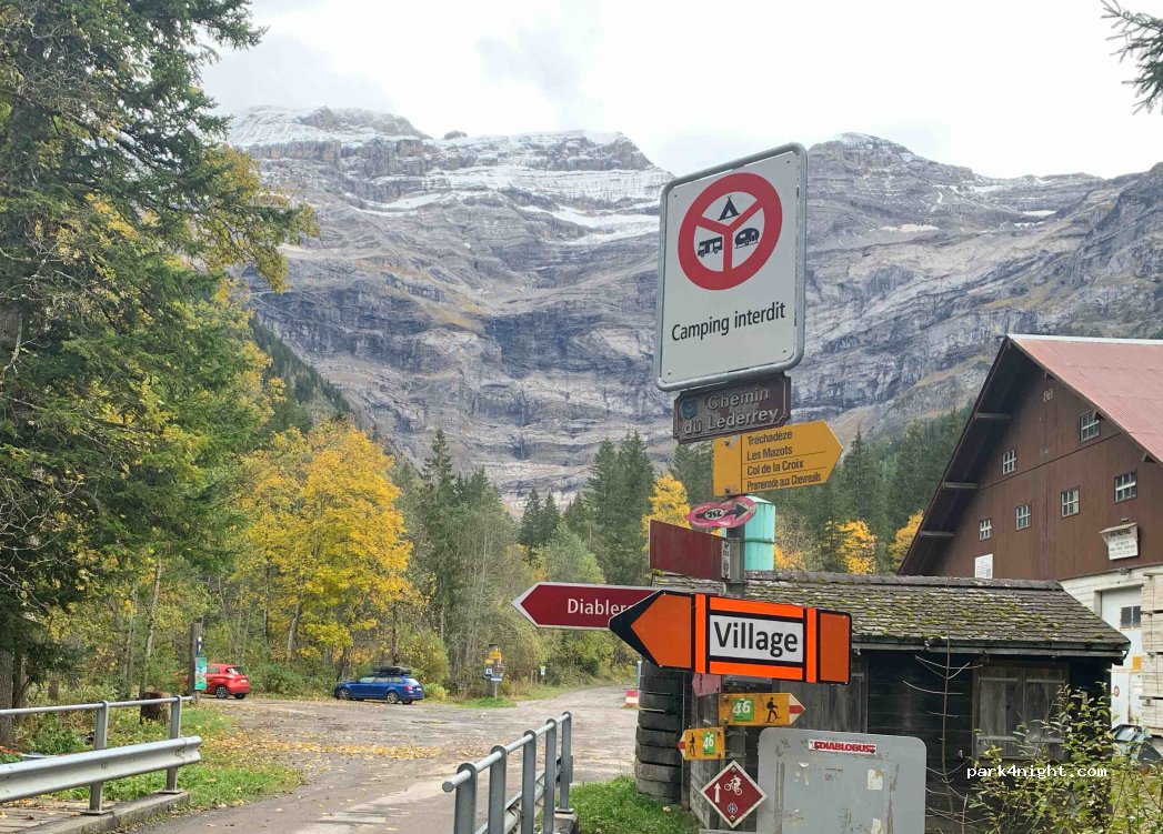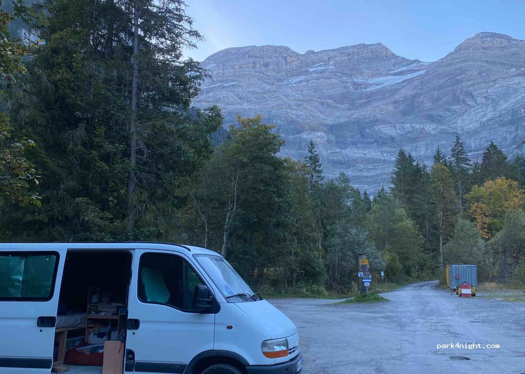 Parking pour départ de randonnée avec vue sur la montagne et un cours d’eau juste à côté. Très calme mais quelques passages de camion